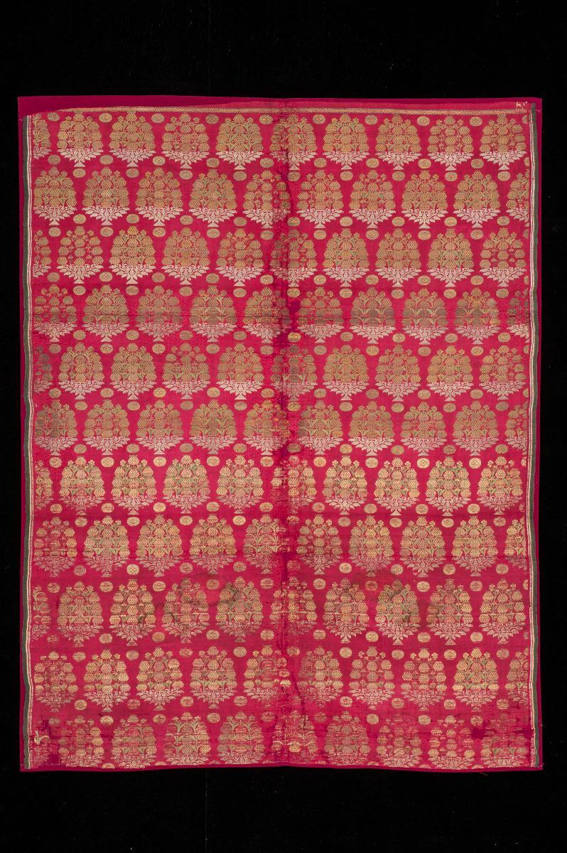 This is a brocade from the Gujarat region of western India. Gujarat was a major centre of textile manufacture and trade, and Gujarati brocades were of fine design and craftsmanship. Although weaving has a long history in the region, many techniques and motifs were brought in from Persia during the reign of the Mughals. Traditional Indian patterns, such as flora and fauna were also integrated into the new approach, leading to the depictions of various symbols on textile.This brocade symbolically represents Vishnu – the trellis pattern is formed by a very unusual fish pattern, while the central motif is a tortoise. The fish and tortoise are the first and second avatars of Vishnu.