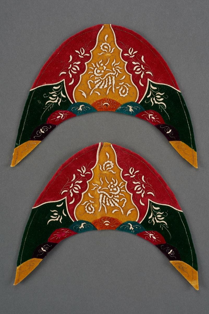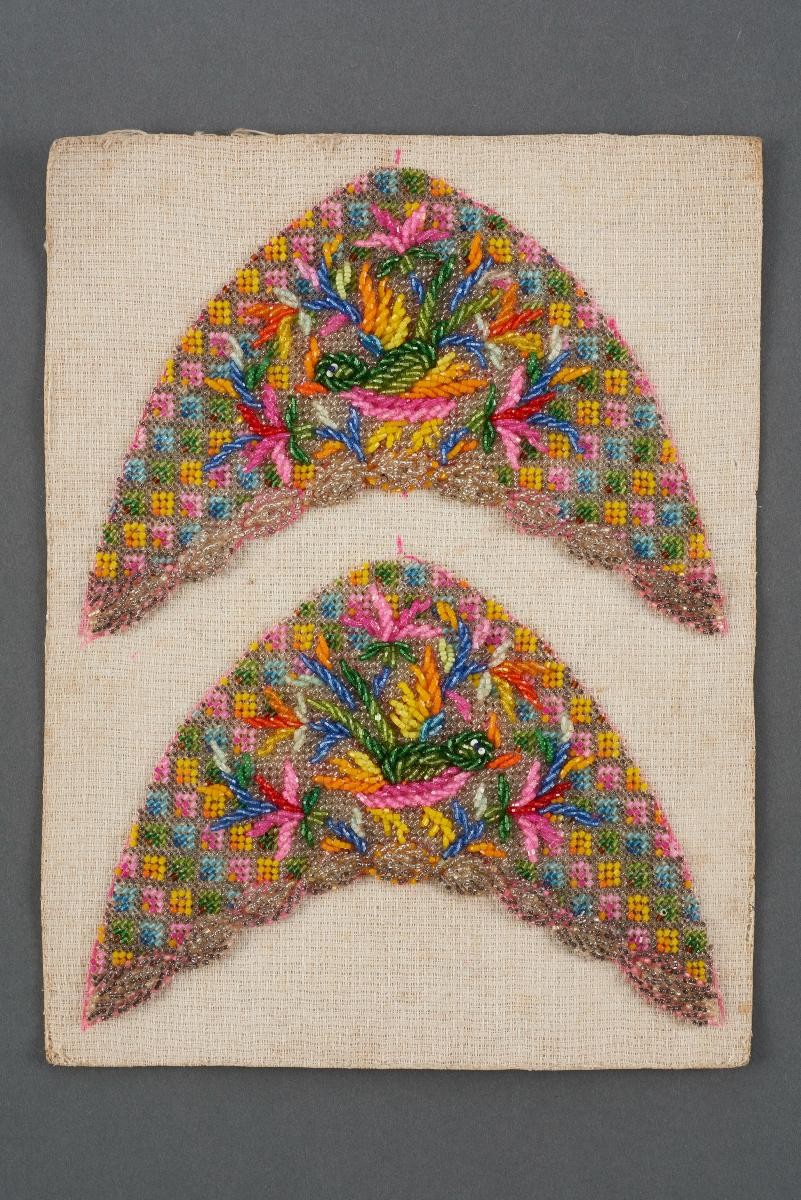 Pre-prepared slipper faces were sold by itinerant haberdashers, where the design was cut from cardboard and pasted on a fabric base. Cardboard details would have been embroidered over to achieve raised thread embroidery. The design on the yellow velvet slipper face consists of a figure of a bird surrounded by foliage and flowers in bloom. A border of different colours and abstract motifs lines the inner edge of the vamp.The acquisition contains numerous examples of templates, patterns and tools embroiderers used in the making of beadwork pieces.