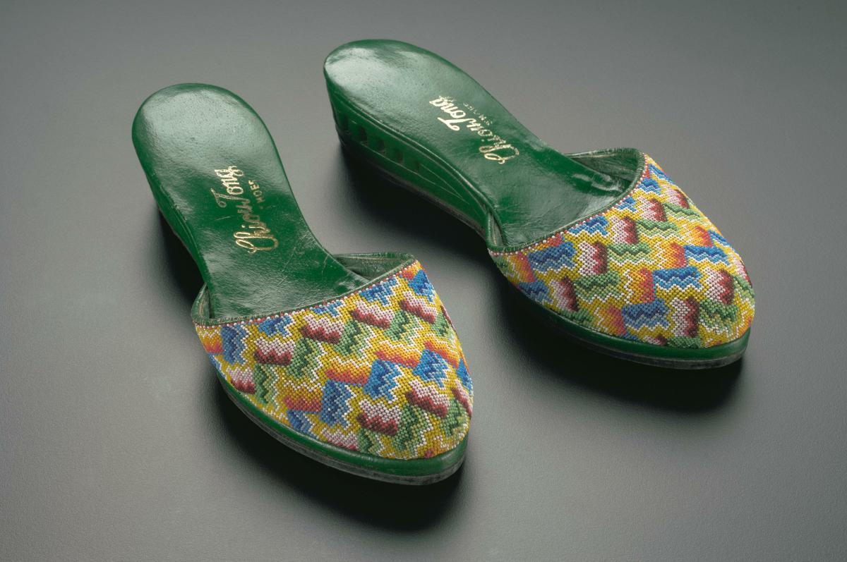 Patterns were used to guide the hand when drawing the outline of a slipper face in order to ensure consistency and accuracy in measurements. This was done with ink or chalk and applied directly onto the fabric.The acquisition contains numerous examples of templates, patterns and tools embroiderers used in the making of beadwork pieces.