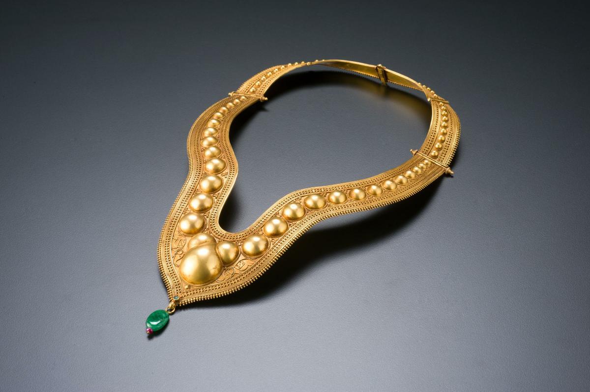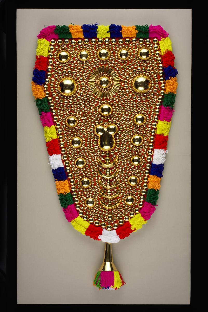 This ornate gold-plated nettipattam or caparison would have been part of the ornamentation of an elephant for a festival celebration in Kerala. This is a typical example of an elephant caparison, with a core of copper coated with gold, having five spherical fixtures and edged with a fringe of yarn, backed with textile.The nettipattam is symbolic of the elephant-headed god Ganesha. Elephants are central to large festivals and celebrations in Kerala, with at least one decorated elephant being present at any large festival, regardless of religion or community. Caparisoned elephants are particularly associated with the Thrissur Pooram, an annual festival held at the Vadakkunnathan Temple in Thrissur, Kerala.