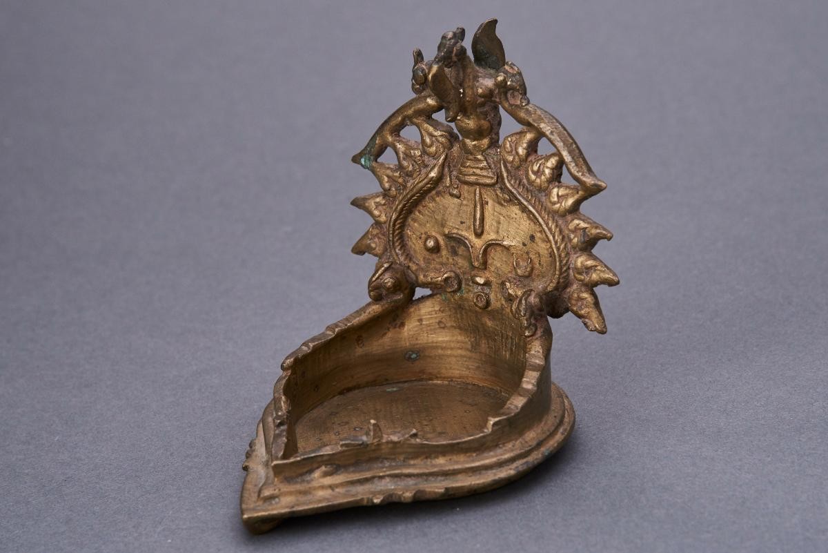 This hanging oil lamp or thookkuvilakku is a typical Kerala design, frequently seen at temples in the region. Made of bell metal, the lamp would be lit by multiple wicks and suspended from a low beam or rafter, to make it easy to light.