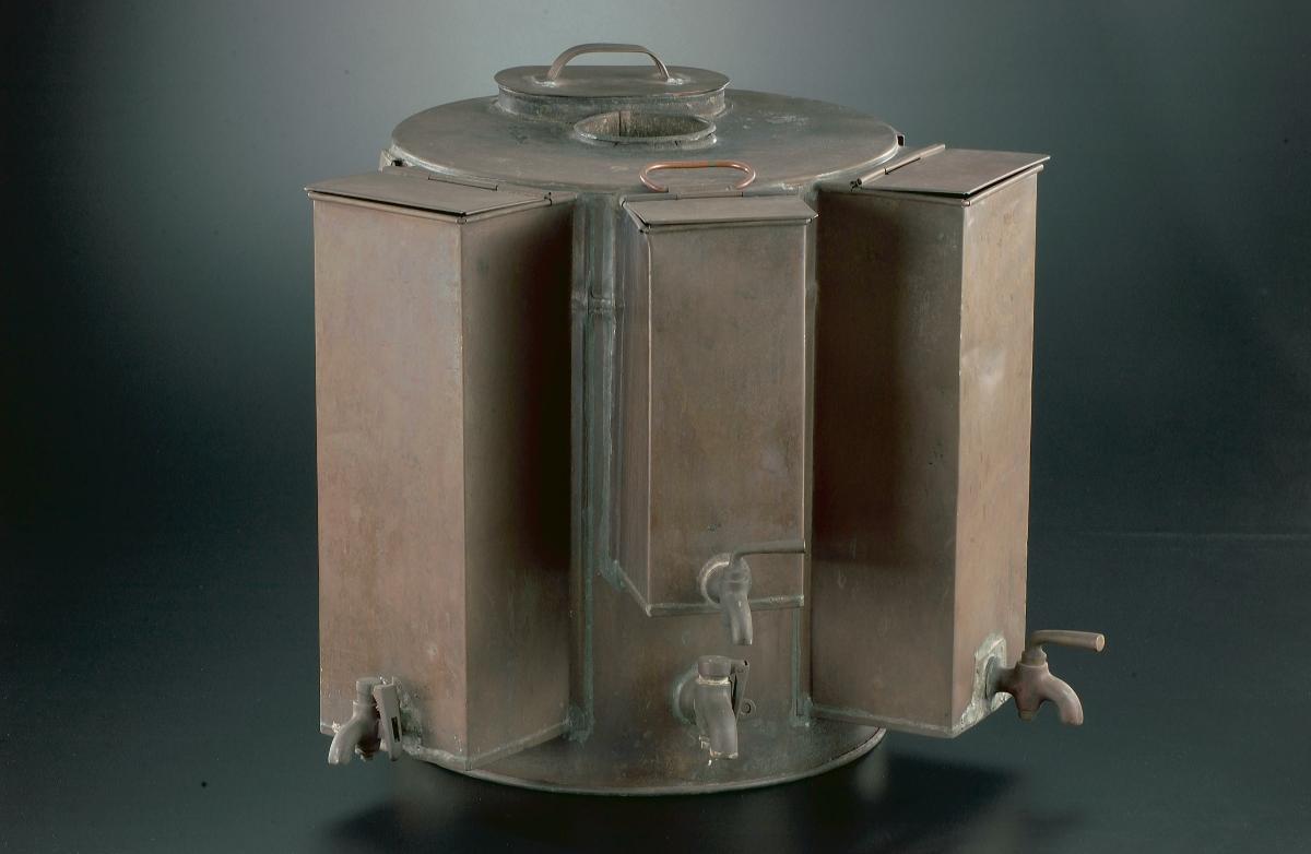 This copper water boiler is typical of the type used to make “boiler tea” in south India and Sri Lanka from the 20th century, and would have been seen at tea shops, stalls and restaurants. The boiler would be used to heat a large quantity of water over a coal fire, or similar type of long-burning fuel. The tea maker would use hot water from the boiler to brew tea. It is an interesting artefact from the 20th century, and reflects the rise in popularity in beverages such as tea and coffee among Indians, during the Colonial era, and the paraphernalia that has since become associated with their consumption. This type of water boiler is becoming increasingly rare with the emergence of cheaper fuel, as well as changing methods of brewing tea.