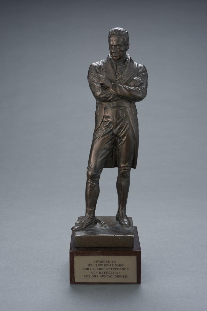 This Raffles plaque was given to Low Kway Song in appreciation of his attendance at the 1978 Old Rafflesians’ Association (ORA) annual dinner. The ORA was established in 1923, with Song Ong Siang serving as its first President. Low’s attachment to his alma mater was reflected in the naming of his first studio as Raffles studio. Low was a self-taught artist who painted portraits of notable personalities in Singapore and Malaya. Besides being a pioneer artist in Singapore, Low was also deeply involved in the performing arts as a member of the Merrilads Musical and Dramatic Association, a popular Peranakan performing group established in 1923.