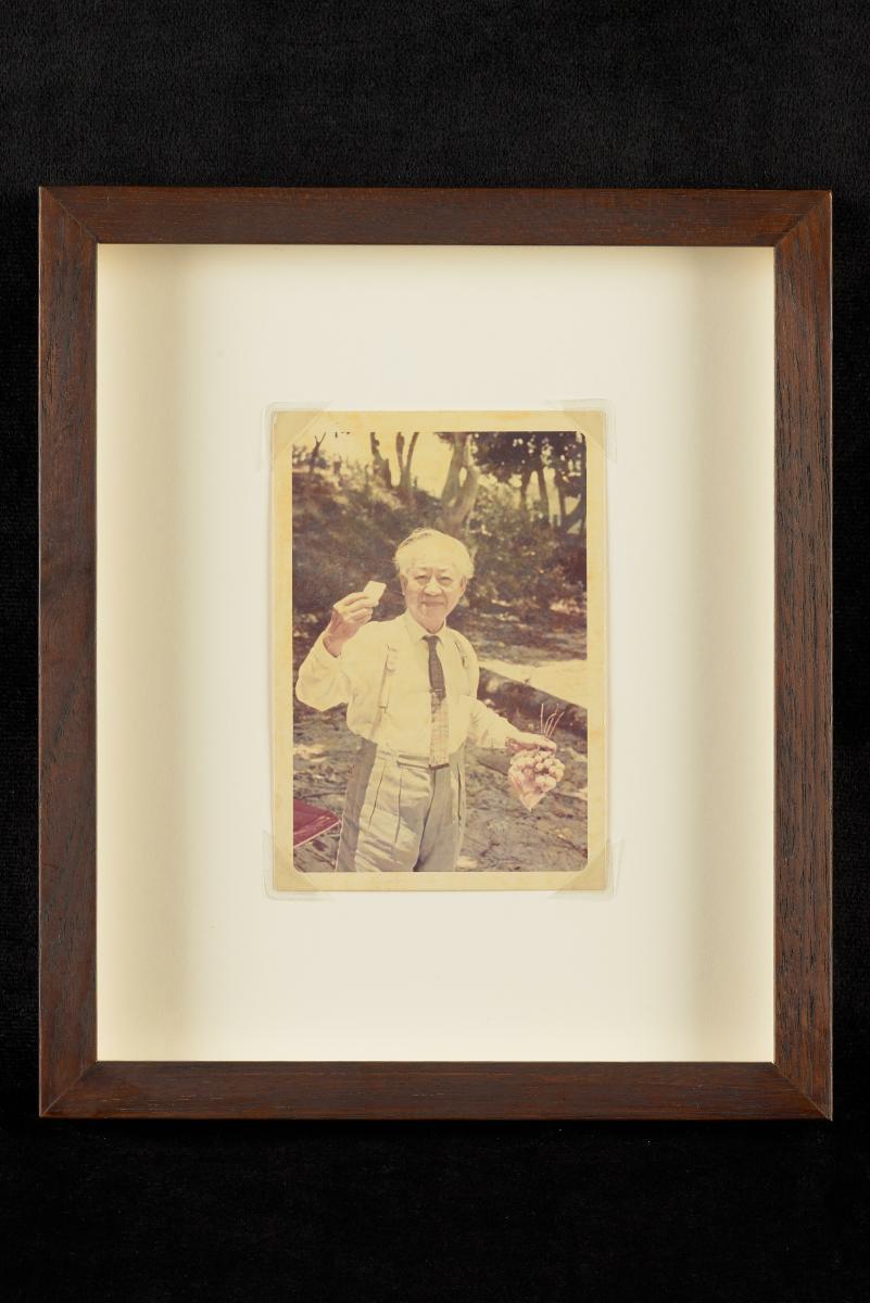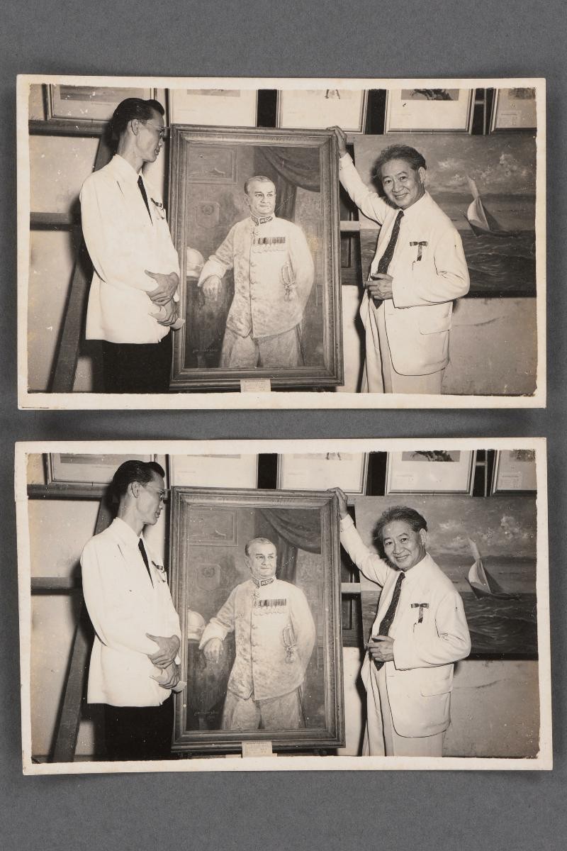 This studio portrait features Low Kway Song examining a print of his painting of Dr Sun Yat Sen. It is stamped at the bottom with the mark of “Mei Photographers.” Postcards were made featuring this painting and sold to raise funds for Sun Yat Sen’s revolutionary movement. Low Kway Song was a self-taught artist who painted portraits of notable personalities in Singapore and Malaya. Besides being a pioneer Singapore artist, he was also deeply involved in the performing arts as a member of the Merrilads Musical and Dramatic Association, a popular Peranakan performing group established in 1923.