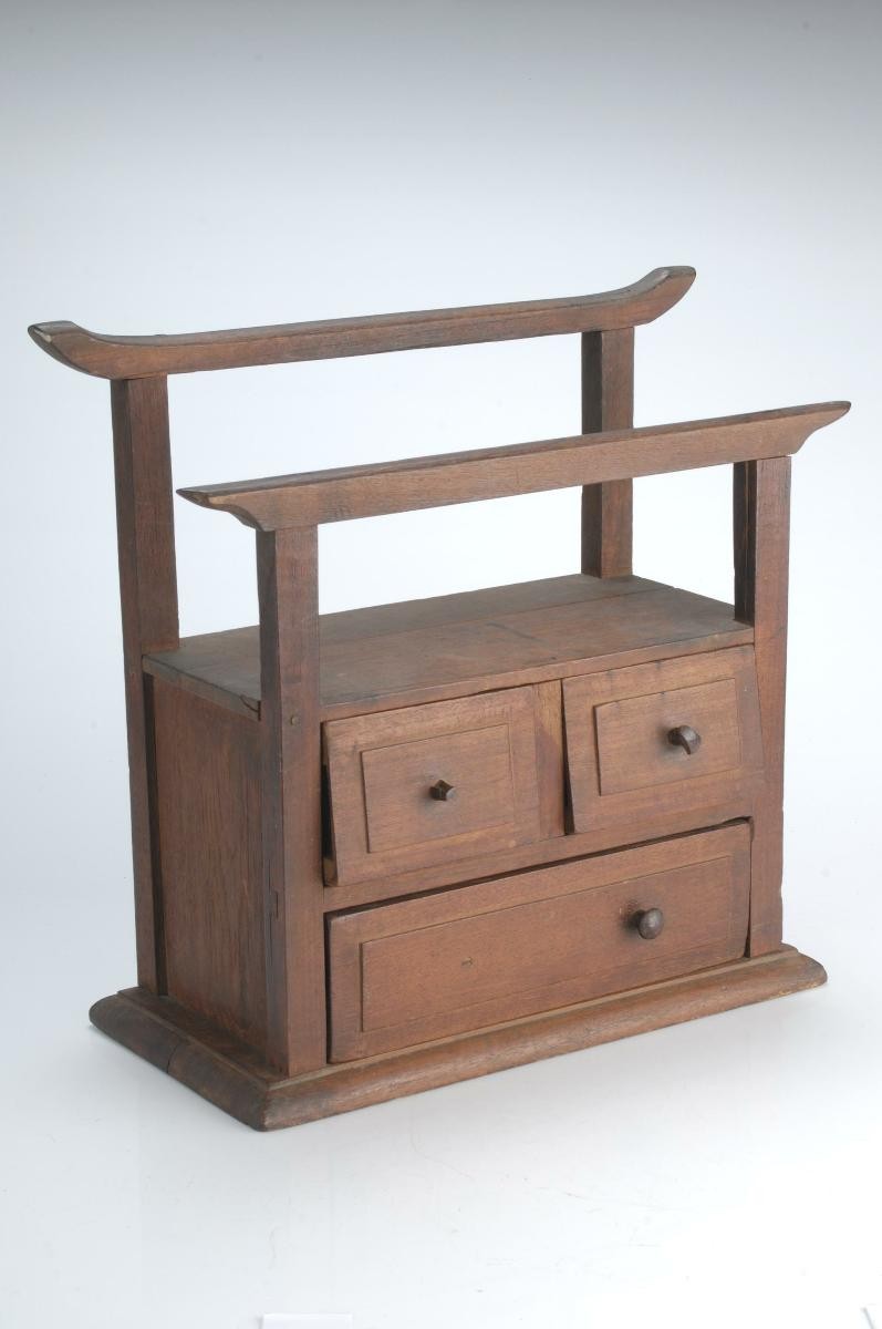 This box was used to store the beads and needles used for nyonya needlework. It has a picture on the cover surrounded by a border of scrolls. Seed beads are hallmarks of Peranakan needlework and were traditionally referred to as manek potong (cut beads) regardless of the types of beads at hand. Strings of beads could be unstrung before being categorised and placed into small bottles for use. Needles used for beadwork are nearly identical to those utilised in embroidery. The original owner of these items made a living fashioning beaded slippers and dresses, working from home as she did not have a shop.