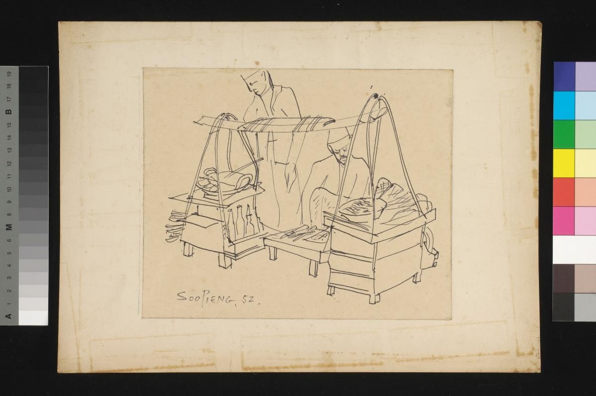 This image features Mr Masudul Hasan, who operated the M. Hasan Railway Food Canteen on Platform 1 of the Tanjong Pagar Railway Station before the closure of the station. His older brother ran another eatery in the main concourse of the station. This image is part of the "Tracking Memories" collection by the late Mr Kwek Leng Joo. The collection captures different aspects of the Malayan Railway story in Singapore, documenting an important chapter in the history of Singapore. Some of the works were exhibited at the National Museum of Singapore in 2011, together with the watercolour paintings of Mr Ong Kim Seng.