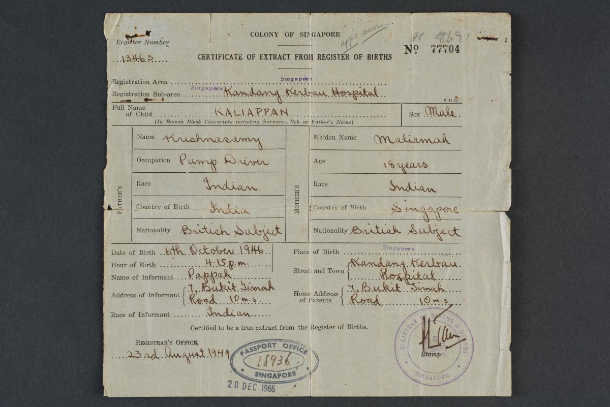 Registration of birth of Kaliappan s/o Krishnasamy (Duplicate copy)