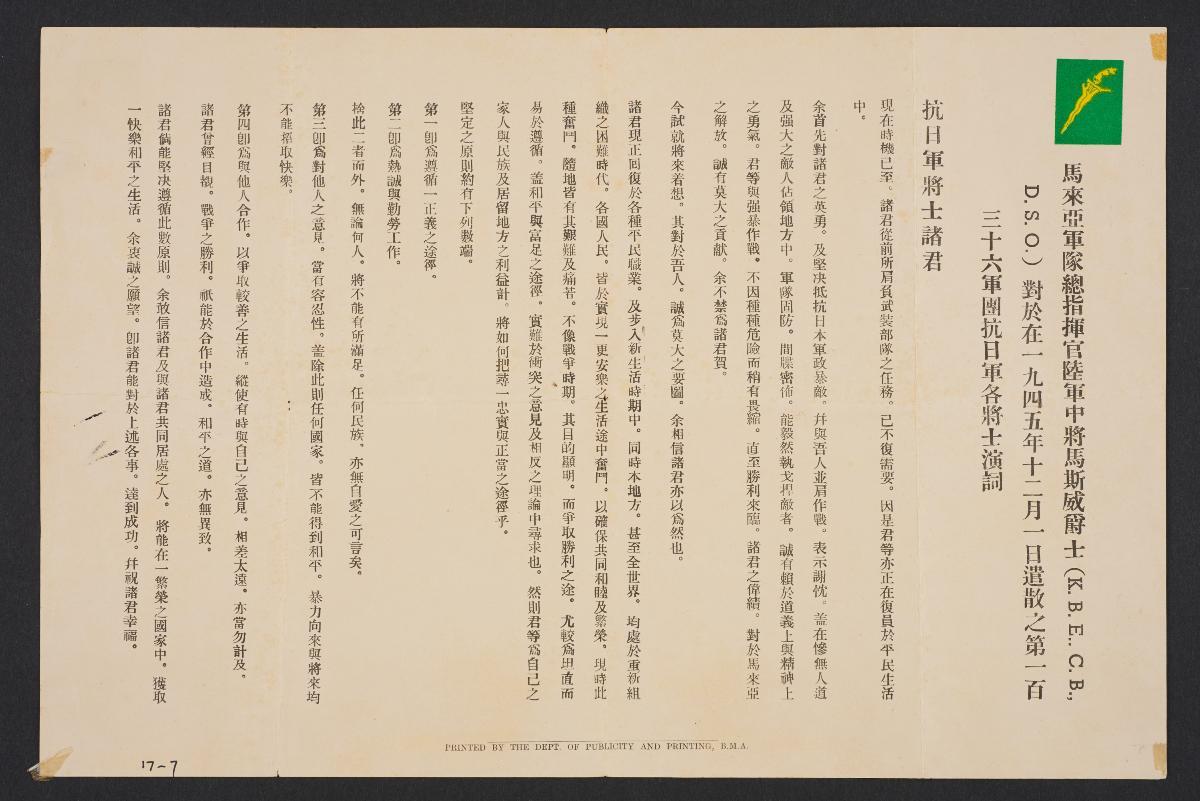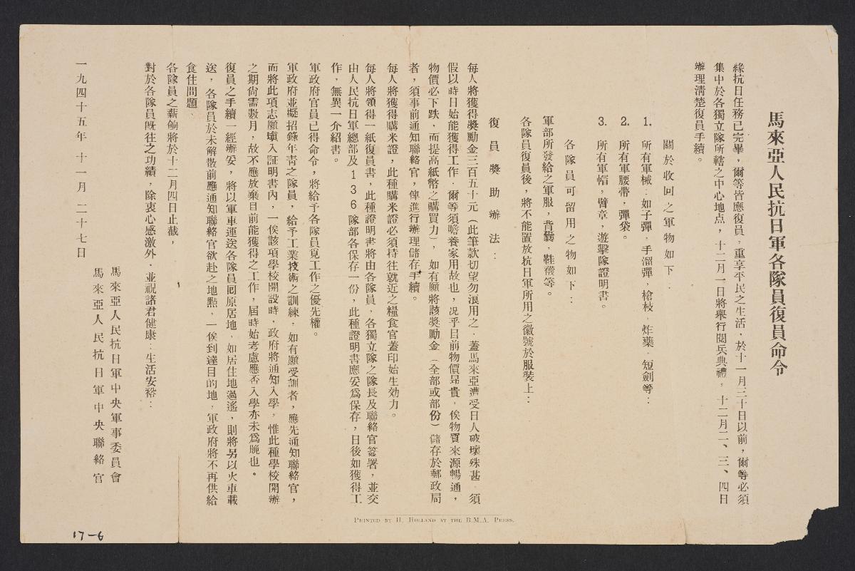 This discharge notice belongs to Chan Phui Kong and forms part of his collection of artefacts related to the World War II underground resistance movement known as Force 136. His collection is part of a larger collection of materials gathered by Tan Chong Tee (1916- 2012), who was a key member of this resistance group. The collection consists of original materials belonging to Tan and other members of Force 136 dating from the 1940s to new materials reproduced from memory by Tan Chong Tee, which date from the late 1980s to early 2000s. Force 136 was set up in July 1942 as part of the British Special Operations Executive (SOE). It recruited and trained local guerillas to gather intelligence and create an underground spy network to support planned British invasion of Japanese-occupied Malaya.