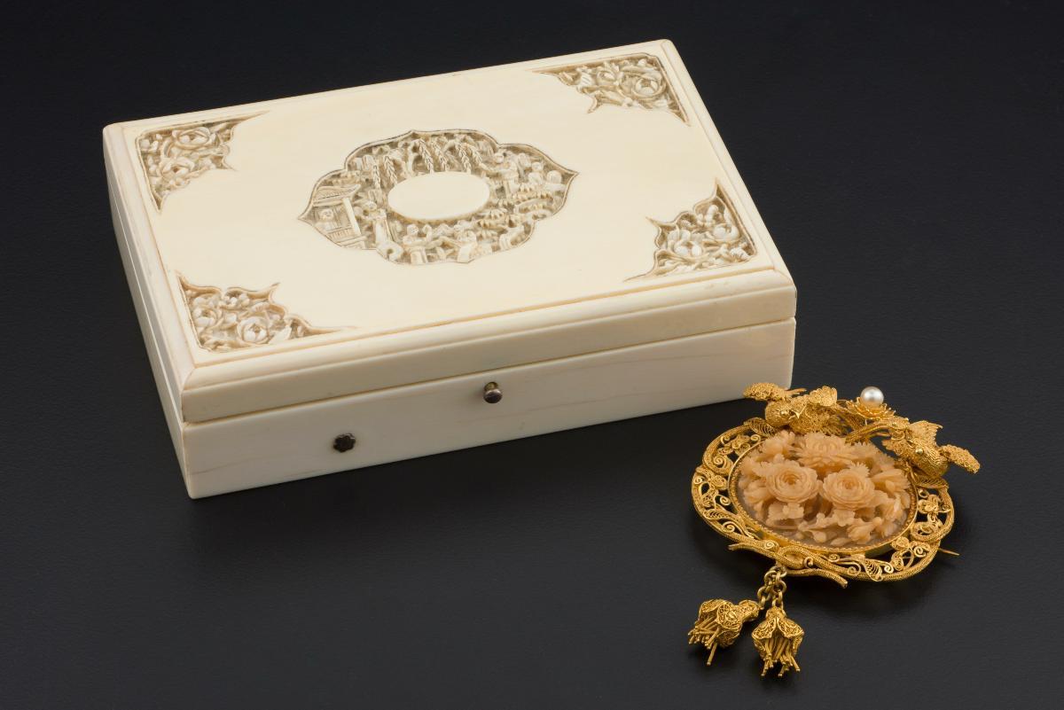 This box of solid ebony is carved on all sides with bold flower and scrolling leaf designs which are known in Sri Lanka, Southern India and the Malay world as the floral pineapple motif. The top is carved with a central sword-fruit flower motif. Inside the box is a tray of lightly coloured wood with nine compartments, each with a lid inlaid with ebony and ivory which has been engraved with scrolling motifs and in-filled wtih black and red lac. Boxes such as these were used in Sri Lanka by ladies to store jewellery and hair ornaments. They were also produced for the colonial market.