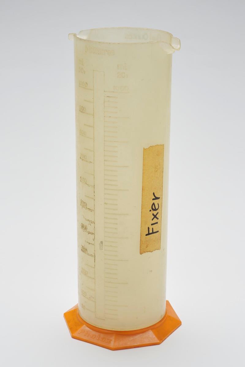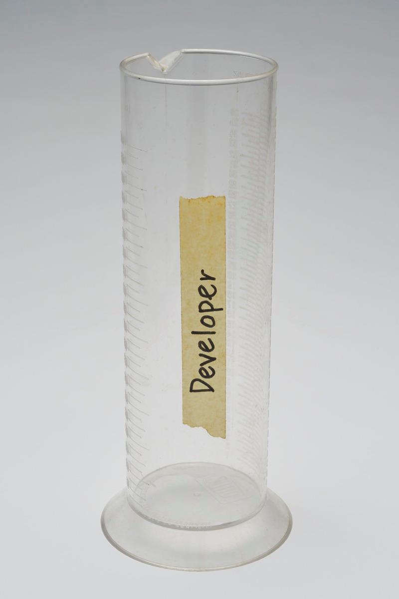 This measuring graduate was used to mix the chemicals needed to develop photographic films. In this case, the measuring graduate was used to mix the stop bath, which has to be done within the right temperature and timing. Mixing the stop bath typically follows the step after the developer in film processing. This measuring graduate is part of the darkroom photography equipment that was previously used by The Picture Farm, which was set up by renowned photographer Willie Tang.