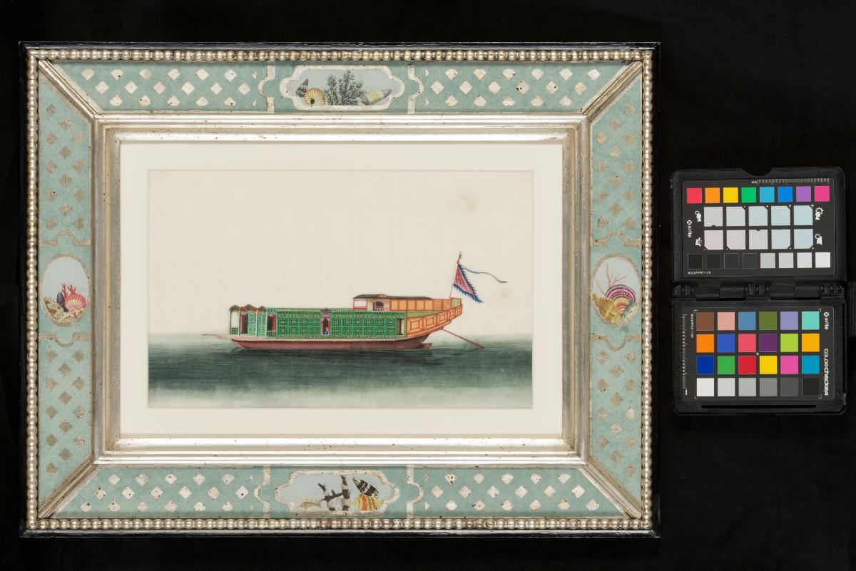 A Parsi merchant, with his colourful turban, European man in a tophat, and Chinese men with long hair queues participate in some as yet unknown activity. The Parsi community was present in Canton by the mid-18th century, helping to facilitate the British-dominated China trade by importing opium and cotton from India into China, while exporting tea and silk back to Europe and beyond. By the 19th century, there was a sizeable community of Europeans.