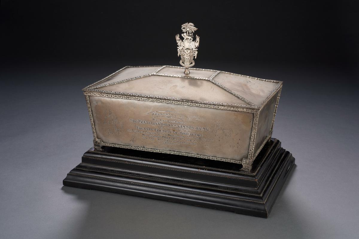 This scroll conferred the Honorary Freedom of the City of Singapore to Sir Franklin Gimson, the first governor of Singapore after World War II. The award was the highest and first such honour bestowed by the city, and was presented to Sir Franklin by the T. P. F. McNiece, President of the City Council of SIngapore. On conferring the award, McNeice paid tribute to Sir Franklin's contributions to Singapore's constitutional developments in paving the way for a democratic way of government.