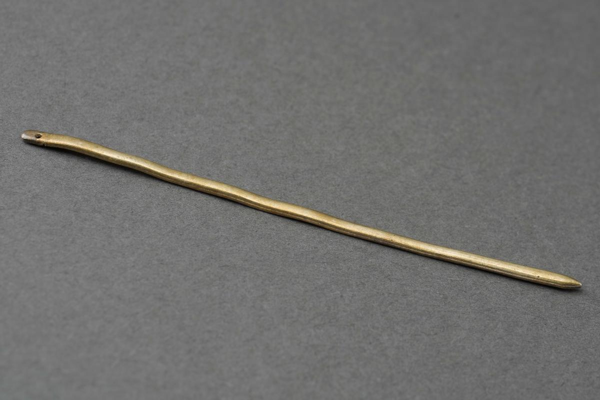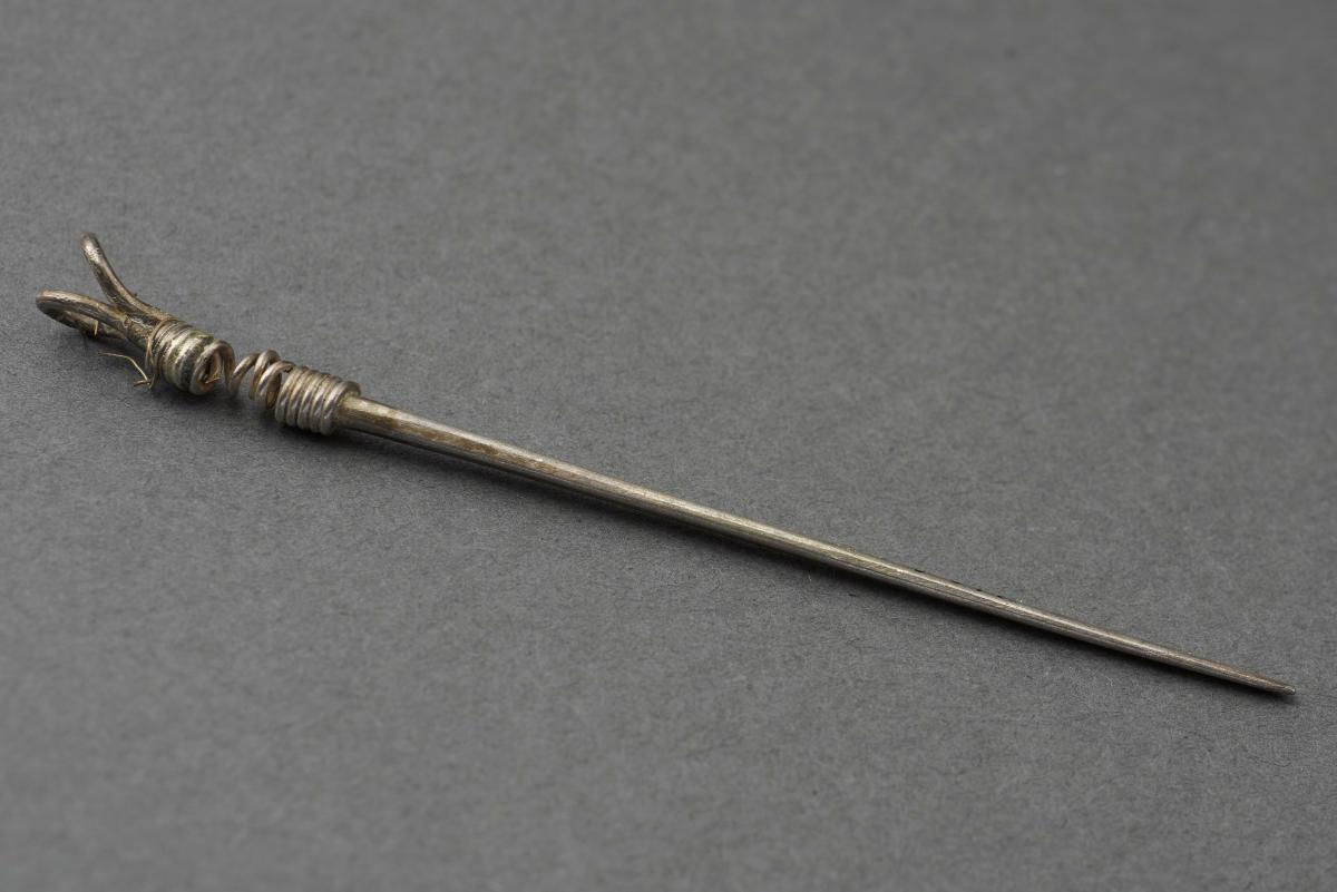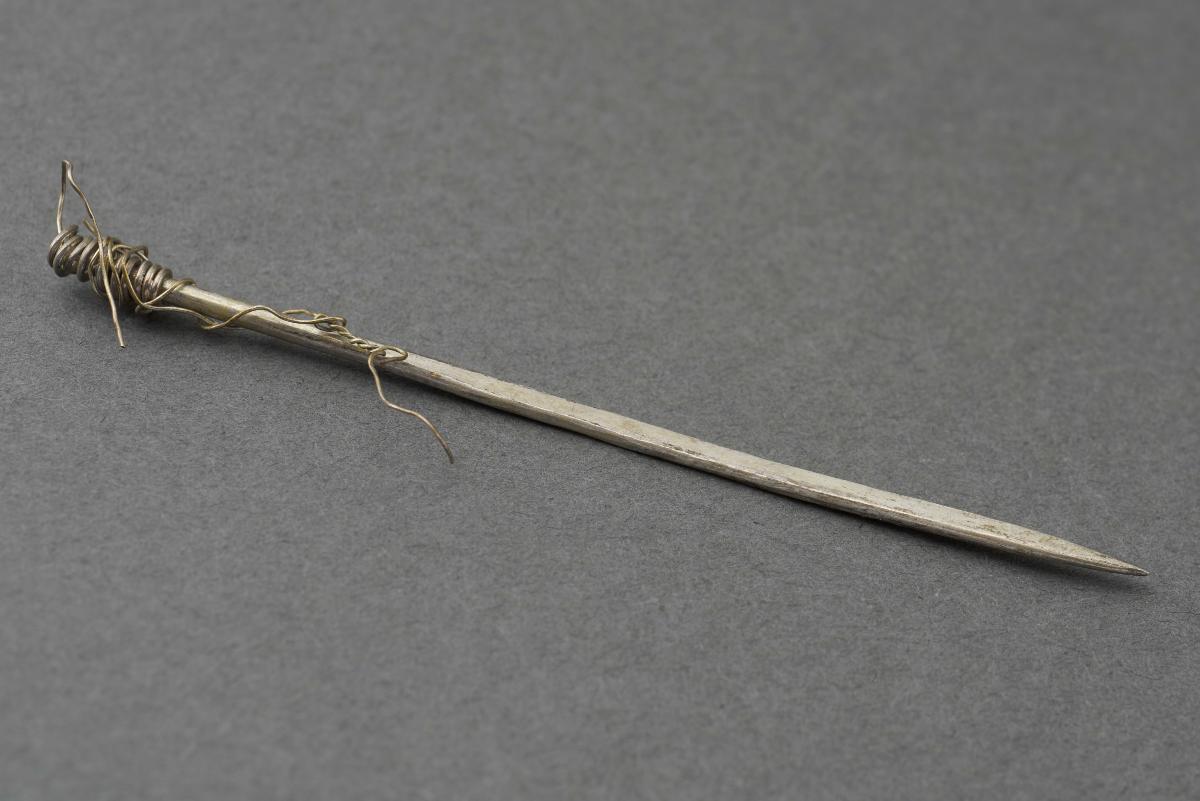 This is a plain hairpin. A decorative ornament is to be attached to the looped section of the hairpin. Small hairpins like this would have been decorative and used only in large quantities on the hair of a Peranakan woman. In small numbers, such hairpins would not be as effective at holding a hair bun in place.Hairpins like this would have been made for Peranakan women in the Straits Settlements to be worn as part of a wedding headdress. A Peranakan bride would tie her hair into a bun or sanggul and individual hairpins would have been stuck in to create a headdress. This hairpin is part of a set that comes from the collection of the family of prominent philanthropists and businessmen, Tan Kim Seng and Tan Jiak Kim.
