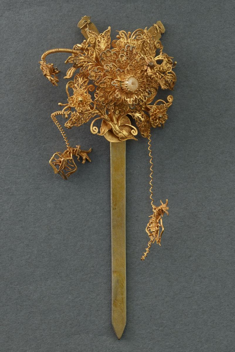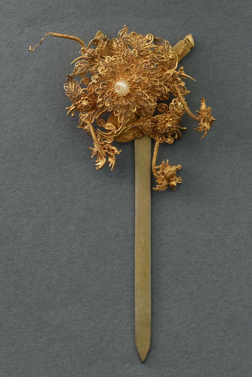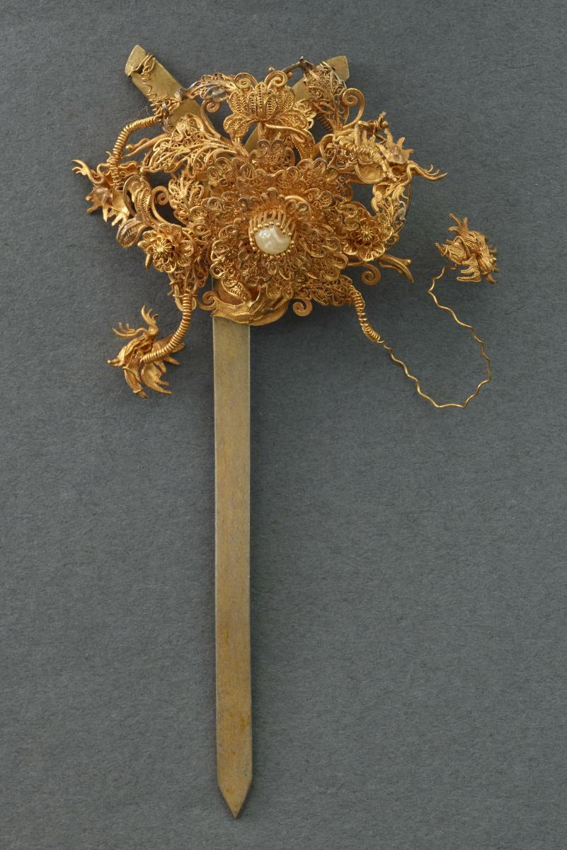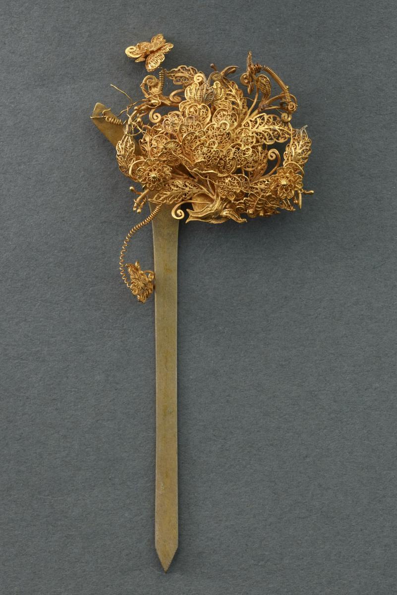 This is a large gold cluster hairpin. At its centre is a large flower with a white stone affixed in it. It is crafted almost entirely in filigree work. Smaller filigree flowers, leaves and birds are also twisted together to form the decoration for the pin.Hairpins like this would have been made for Peranakan women in the Straits Settlements to be worn as part of a wedding headdress. A Peranakan bride would tie her hair into a bun or sanggul and individual hairpins would have been stuck in to create a headdress. This hairpin is part of a set that comes from the collection of the family of prominent philanthropists and businessmen, Tan Kim Seng and Tan Jiak Kim.