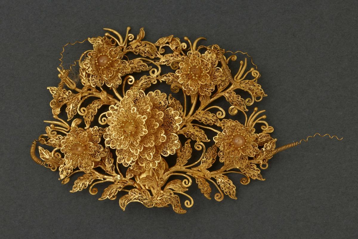 This is a large gold floral cluster crafted in filigree work and with several small stones inserted at the centre of small flowers. Butterflies dart around the flowers and leaves. It is likely that these clusters were attached by twisted gold or silver wire to a plain hairpin and used as hair decoration in the buns of Peranakan women. The shopmark Da Xing (大興) is found on the reverse, This silversmith was one of the more popular companies producing silver and jewellery for the Peranakan market.