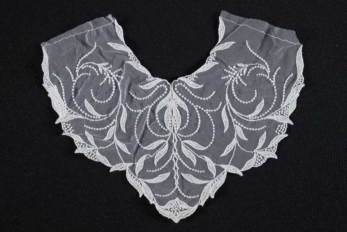 This is a lace sample, consisting of tiny clusters and 3 larger leaves. It belonged to Sylvia Kho, one of Singapore's earliest bridal designers. Although she had learnt Peranakan beadwork and sewing from her mother, she was best known for her western-style wedding gowns. Her dresses were known for their quality, and she would personally source lace and other materials on her trips to Europe and USA. At her peak Sylvia Kho operated three boutiques, and its clientele included brides of wealthy businessmen, politicians, and members of royalty from the region. She was inducted into the Singapore Women’s Hall of Fame in 2017.