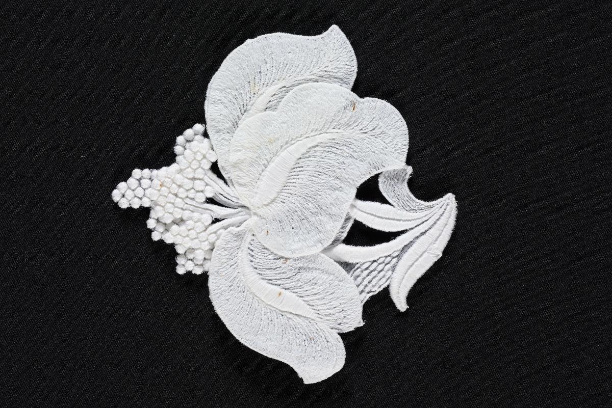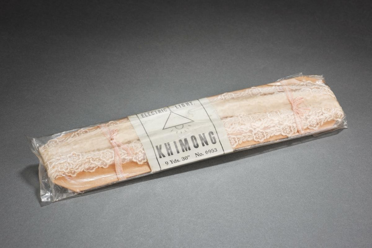 This is a lace sample, consisting of both pink and white lace patterns. The attached tag reads 'A. RIECHERS & FILS CALAIS . PARIS'. It belonged to Sylvia Kho, one of Singapore's earliest bridal designers, and would have been used in her various bridal gowns. Although she had learnt Peranakan beadwork and sewing from her mother, she was best known for her western-style wedding gowns. Her dresses were known for their quality, and she would personally source lace and other materials on her trips to Europe and USA. At her peak Sylvia Kho operated three boutiques, and its clientele included brides of wealthy businessmen, politicians, and members of royalty from the region. She was inducted into the Singapore Women’s Hall of Fame in 2017.