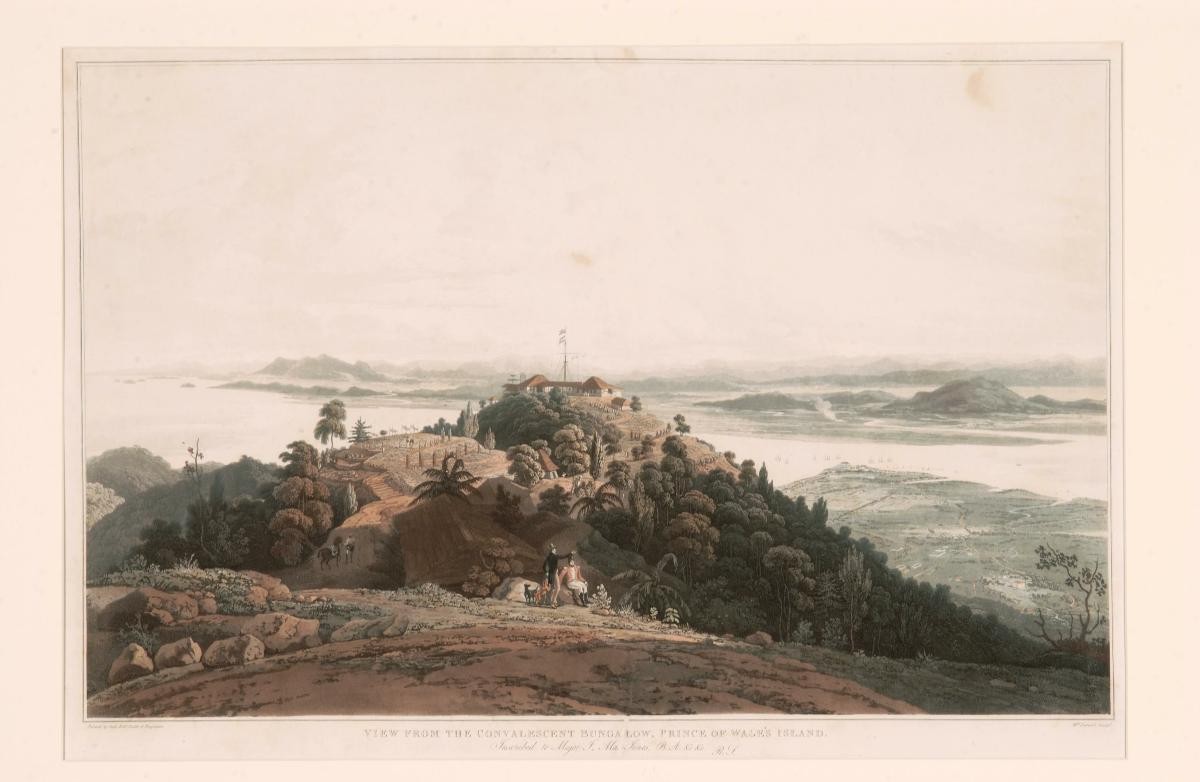 This print features a view of Fort Cornwallis in Penang, with the light house and flagstaff bearing the British flag. Penang was ceded to the British East India Company in 1786, with the settlement built around Fort Cornwallis, named after the Governor-General of Bengal at that time.