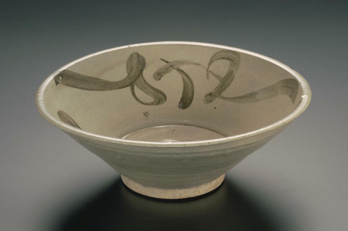 This bowl, which appears plain at first glance but reveals its subtle patterns on closer inspection, features an anhua 暗花 (‘hidden decoration’) design of a three-clawed dragon chasing a pearl. This is paired with a sketchy blue scroll painted around the narrow foot rim. The use of anhua decoration on porcelain is thought to have begun in the Ming dynasty during the reign of the Yongle emperor (1403–1424), and refers to delicately-incised designs that almost seem to vanish when covered with a glaze.