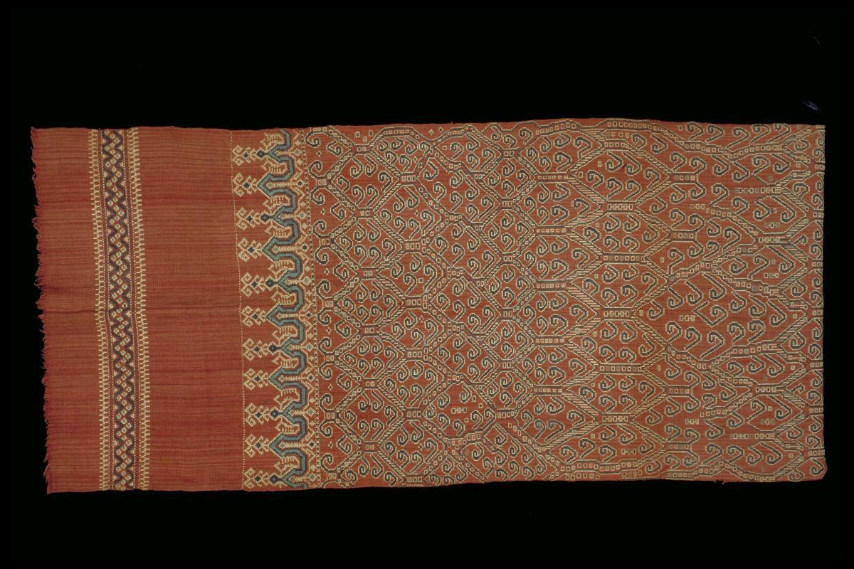 This cloth is a pua sungkit, a type of cloth produced using a rare supplementary warp wrapping technique in which additional coloured threads are carefully wrapped around the warp threads as the cloth is woven. Most pua sungkit have a red ground colour but this one is dyed indigo blue, making it one of the rarest Iban cloths produced.