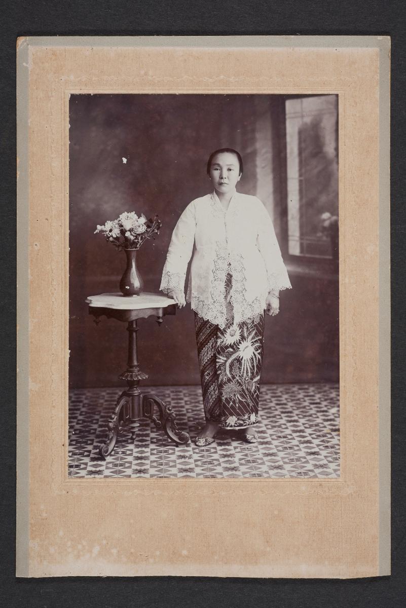 This photograph shows a nyonya, flanked by vases and a spittoon, which are hand-tinted together with the jewellery she wears. The mounting board is stamped with the shop mark ‘Yong Fong Photographic Artist 96, South Bridge Road Singapore.’ Yong Fong was a photography studio run by Lee Yin Fun. His father was also a photographer, and his cousin, Lee King Yan established Lee Brothers Photographers at Hill Street, Singapore. Ranging from formal studio portraits to albums of snapshots of everyday life and stately ancestral portraits, this large group of photographs reveals the many forms of photography available and gives insight into the various aspects of the lives of Peranakans.