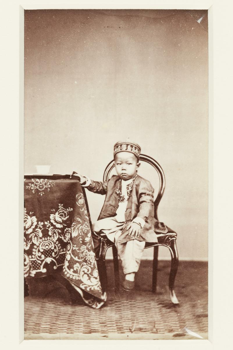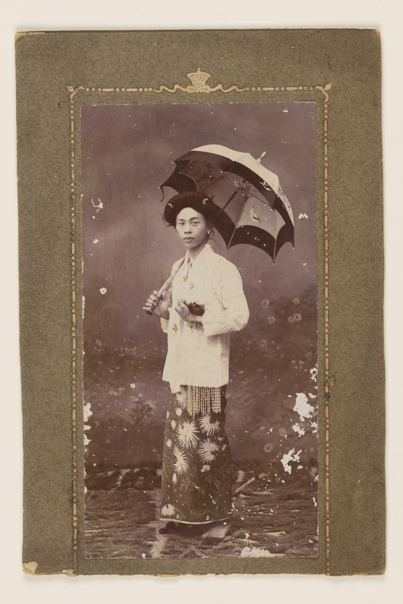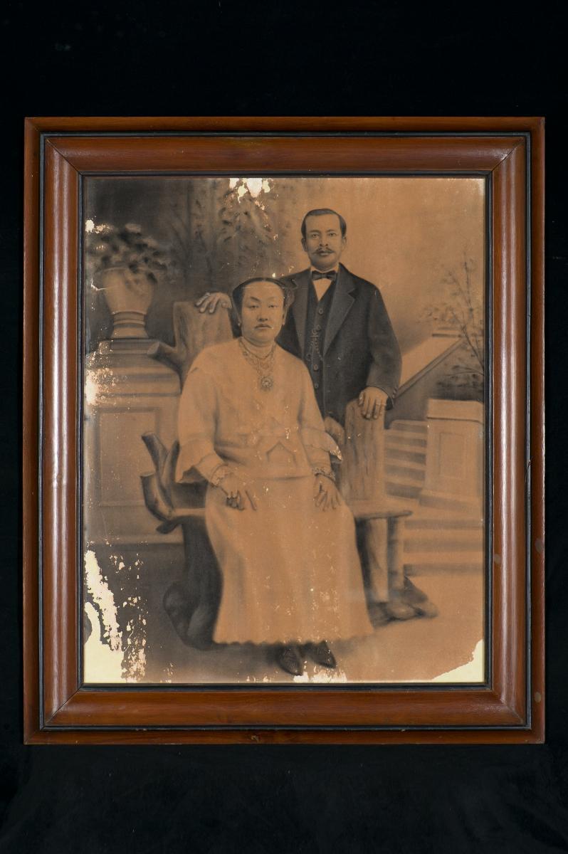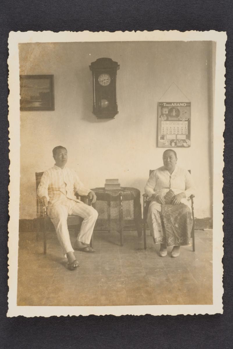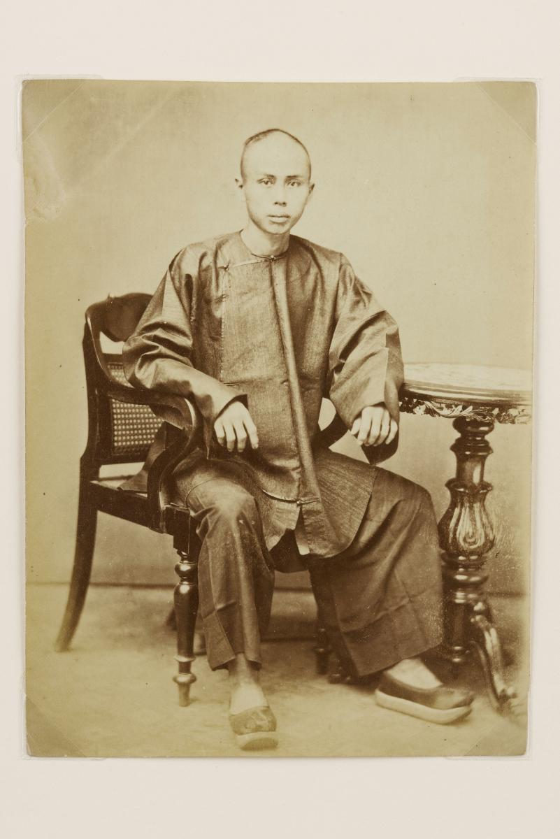 This studio photograph shows a man posing with a frame and vase of flowers. Chinese text is inscribed on both the photograph and the mounting board, which is also stamped with the studio mark ‘Lee Brothers 58-4 Hill St Singapore.’The Lee Brothers was a photography studio run by the brothers Lee King Yan and Lee Poh Yan at 58-4 Hill Street between 1910 and 1940. Many of the leading personalities of the day, like Lim Boon Keng and Mrs Lee Choon Guan sat for photographs taken by the studio.Ranging from formal studio portraits to albums of snapshots of everyday life and stately ancestral portraits, this large group of photographs reveals the many forms of photography available and gives insight into the various aspects of the lives of Peranakans.