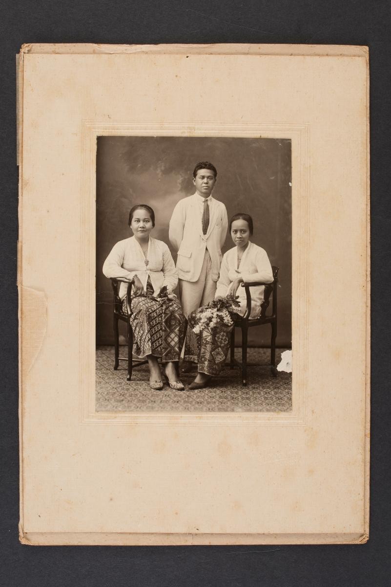 This shows two nyonyas sitting by a table with a potted plant. It is stamped with the studio mark ‘Meng Hong B. Metajam.’ Studios were already established across the Strait Settlements and the Dutch East Indies by the 1840s and became increasingly prevalent in the 1850s. During the 1920s, Chinese-owned studios dominated the studio photography trade in Southeast Asia. Ranging from formal studio portraits to albums of snapshots of everyday life and stately ancestral portraits, this large group of photographs reveals the many forms of photography available and gives insight into the various aspects of the lives of Peranakans.