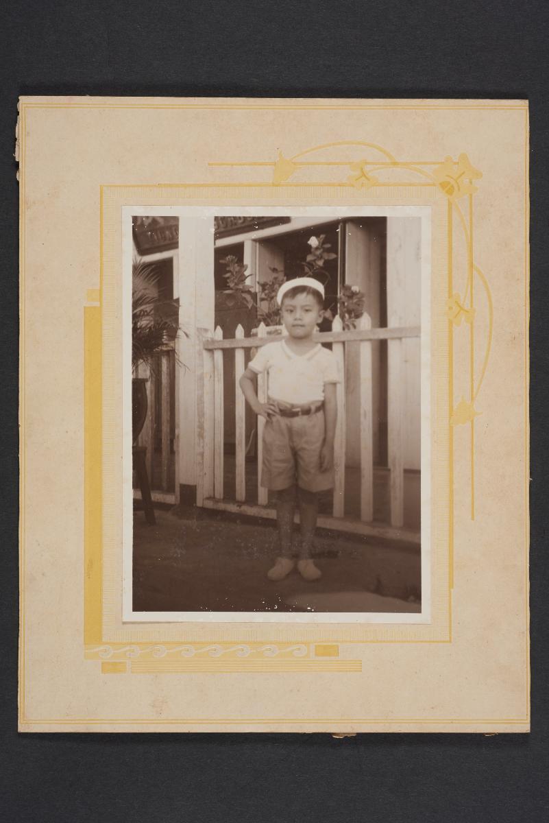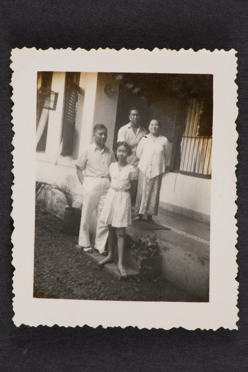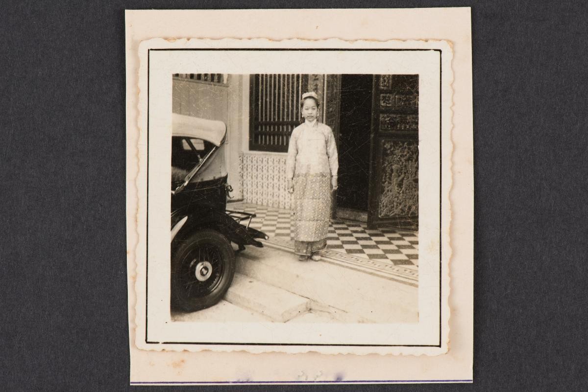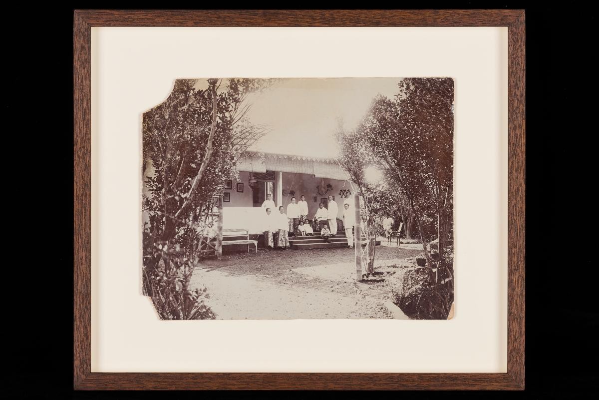 This photograph shows a large group posing on the porch. It was found with a board which was stamped with the studio mark ‘Sin Kion Kwok Studio 74 Queen’s road, Hong Kong.’Ranging from formal studio portraits to albums of snapshots of everyday life and stately ancestral portraits, this large group of photographs reveals the many forms of photography available and gives insight into the various aspects of the lives of Peranakans.