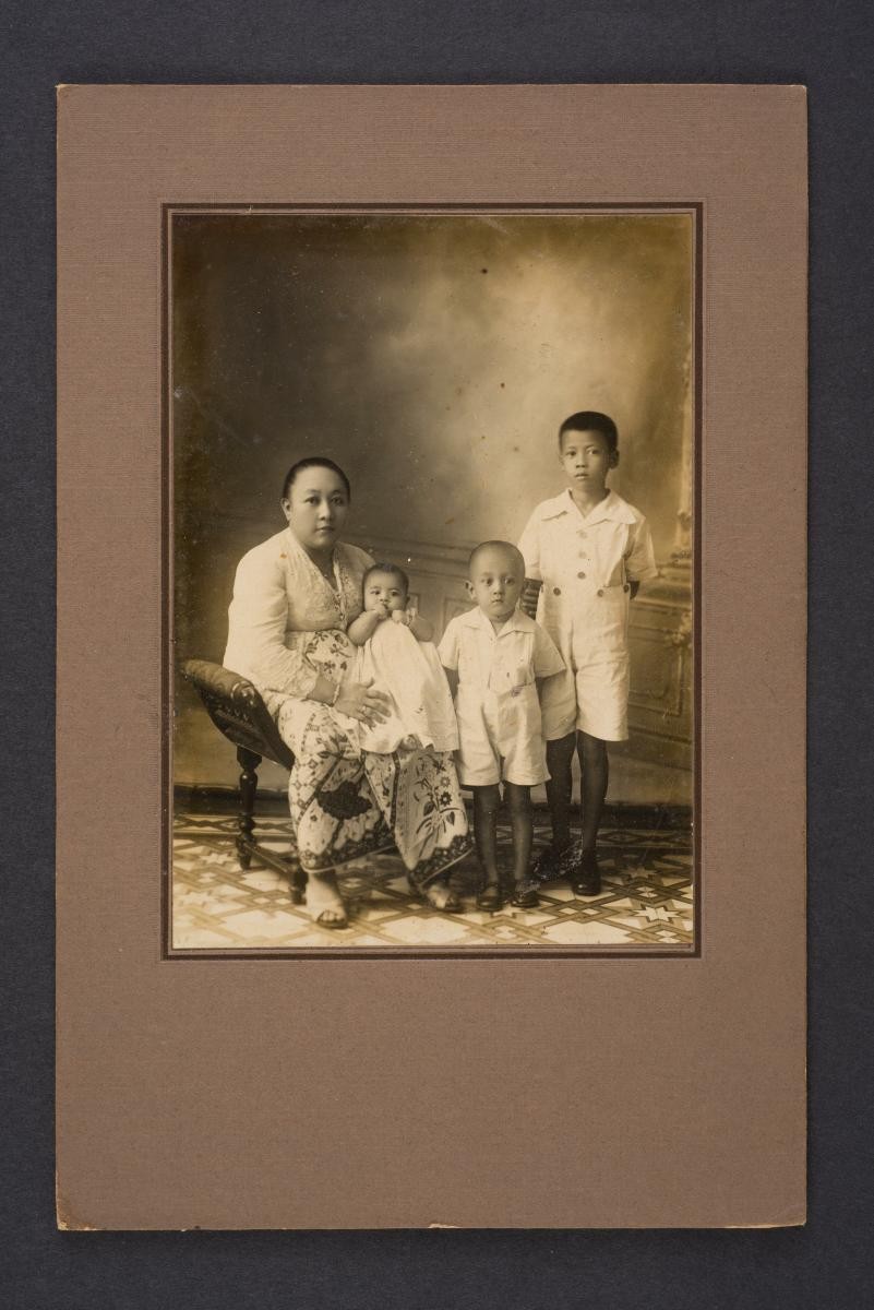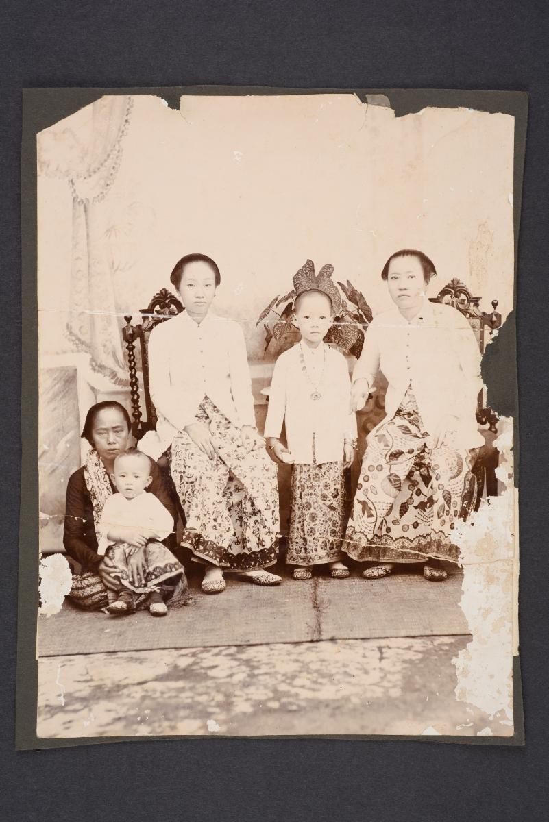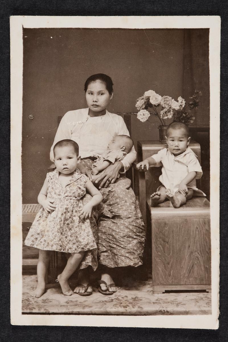 This studio photograph shows a lady with a child seated on her lap and another beside her. It is stamped with the shop mark ‘The Keechun Studio, 22A Leith Street Penang.’ Studios were already established across the Strait Settlements and the Dutch East Indies by the 1840s and became increasingly prevalent in the 1850s. During the 1920s, Chinese-owned studios dominated the studio photography trade in Southeast Asia. Ranging from formal studio portraits to albums of snapshots of everyday life and stately ancestral portraits, this large group of photographs reveals the many forms of photography available and gives insight into the various aspects of the lives of Peranakans.