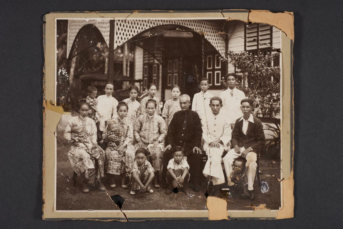 This photograph shows a bride and groom on a porch. It is stamped with the studio mark ‘Hokkien Day and Night Photographer 422 Beach Street, Penang. Branch 193 Carnarvon Street, Penang.’Studios were already established across the Strait Settlements and the Dutch East Indies by the 1840s and became increasingly prevalent in the 1850s. During the 1920s, Chinese-owned studios dominated the studio photography trade in Southeast Asia. Ranging from formal studio portraits to albums of snapshots of everyday life and stately ancestral portraits, this large group of photographs reveals the many forms of photography available and gives insight into the various aspects of the lives of Peranakans.