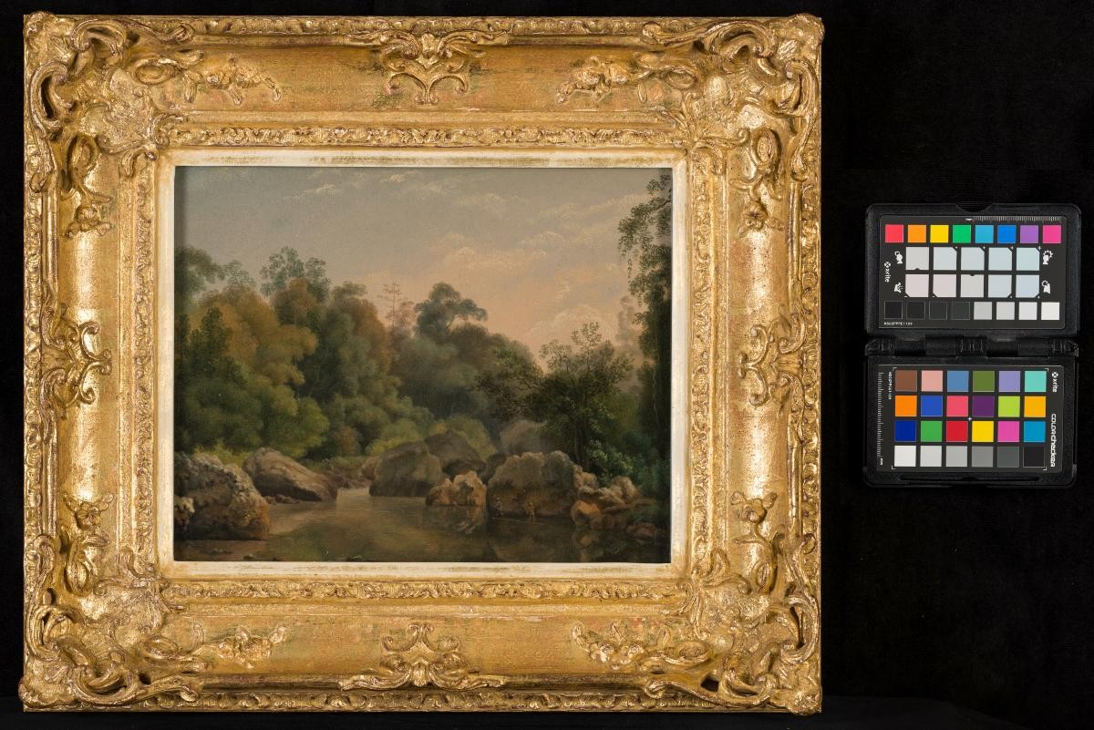 This is a wash drawing of a party on horseback crossing a river at Buitenzorg (present day Bogor) in Java, with Gunung Salak in the background. It is a scene based on an aquatint attributed to William Daniell in Lady Raffles's Memoir of the Life and Public Services of Sir Thomas Stamford Raffles, which itself was based on an original 1816 drawing by Mary Fendall, daughter of John Fendall, the successor to Raffles as Lieutenant-Governor of Java.