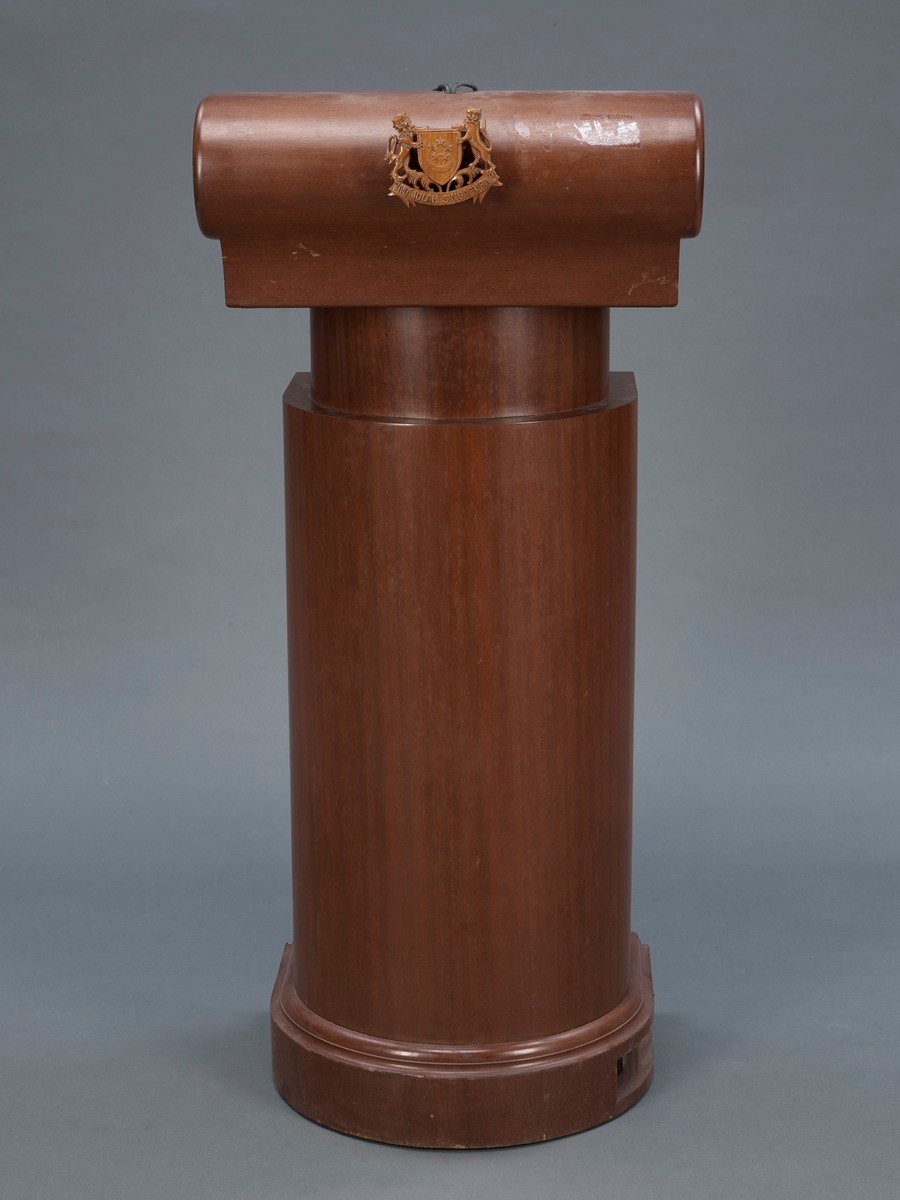 This state lectern was used by Mr Lee Kuan Yew from 1987 to 2003 in his capacity as Prime Minister, Senior Minister and Member of Parliament for Tanjong Pagar. The lectern was used by Mr Lee to deliver speeches at his constituency’s Chinese New Year and National Day Dinners, along with official events such as the opening of the Mass Rapid Transit system and Cabinet swearing-in ceremony in 1988. It was also used at Mr Lee’s 75th and 80th birthday celebrations in 1998 and 2003.