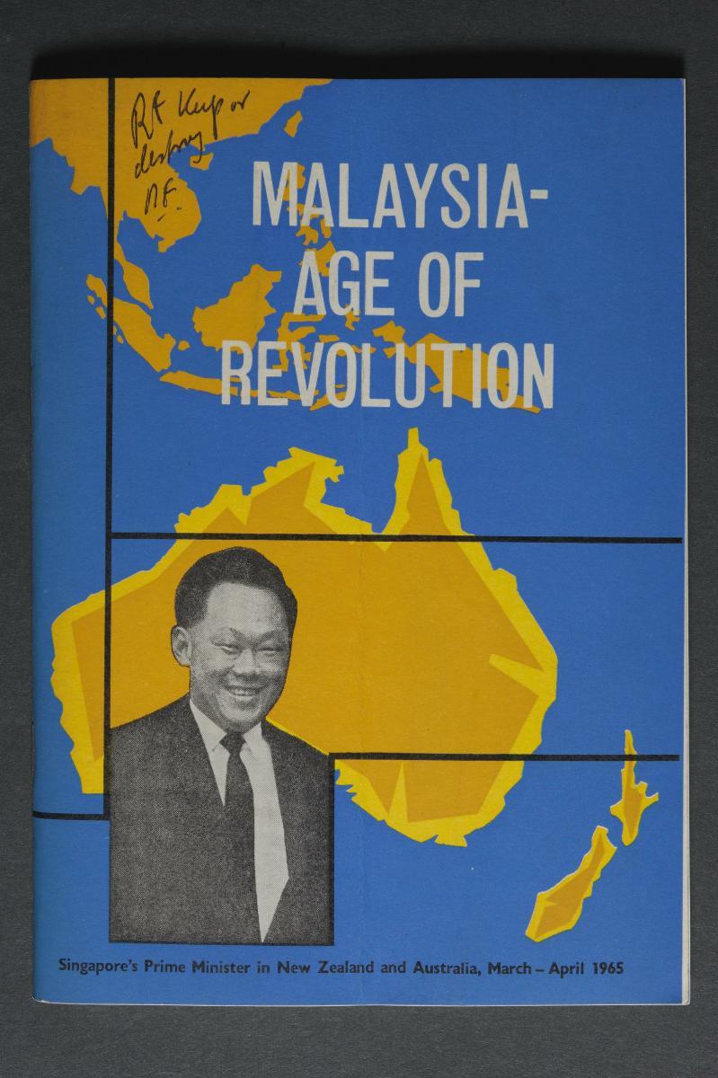 This poster which reads “The course of our revolution - Djarek: Djalannja revolusi kita (Djarek)”, presents colourful images of fighters in military uniform alongside a farmer in a hat and female in traditional Indonesian dress striding forward armed with guns, knives and bamboo spears and holding a waving flag. The revolution being referenced is Indonesia’s drive for independence from the Netherlands. ‘Djarek’, which is referenced by the poster is the title of a speech delivered by Sukarno on Independence day on August 17, 1961, which marked the start of the official construction of the National Monument, which eventually opened in 1975. This small poster printed by Perjia Djakarta, East Jakarata Indonesia. The speech ‘Djarek’ was significant for the anti-imperialist views it expressed and it’s condemnation of Malaysia as a “puppet” of imperialism.
