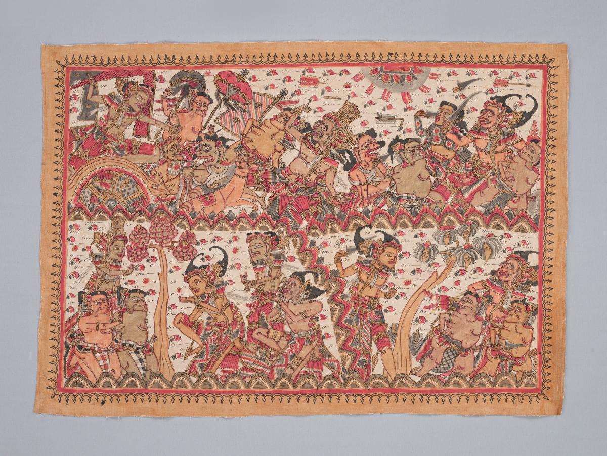 This traditional Balinese painting pictures the punishments awaiting evil doers in Hell. It is painted in the Kamasan style, a very traditional form of painting associated with the village of Kamasan in Klunkung regency on the island of Bali. The village was known as a centre for producing artists and painters in the customary style and strictly depicted visual narratives of the Hindu-Javanese epics such as the Mahabharata and Ramayana as well as indigenous tales like the Panji stories primarily for religious and ceremonial purposes.