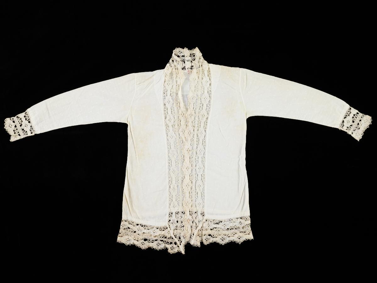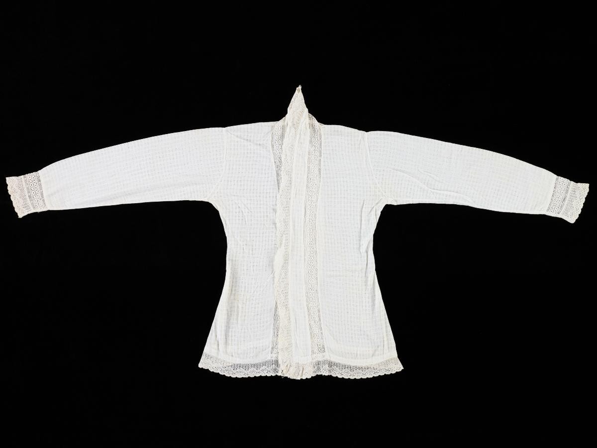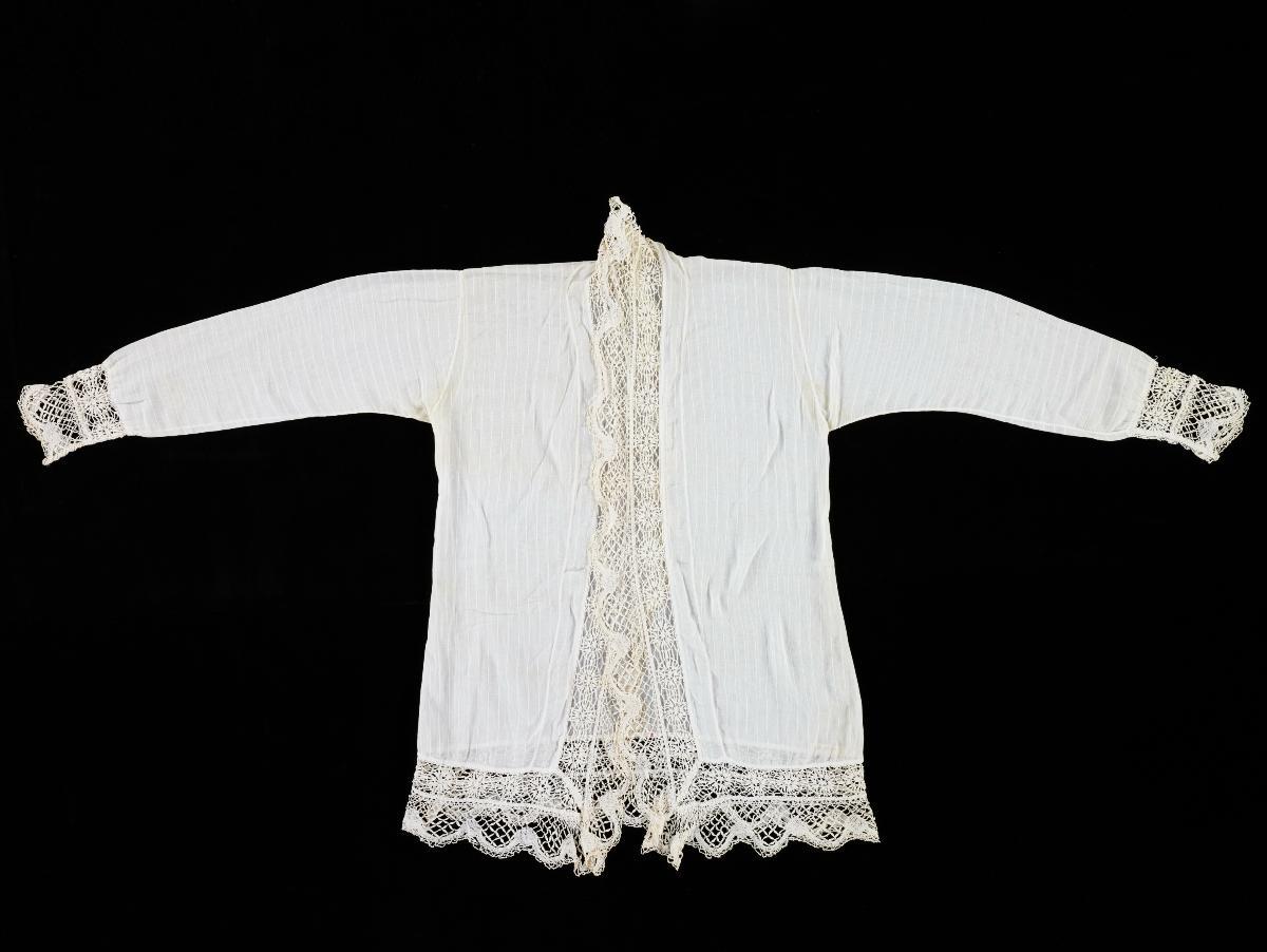 This white cotton blouse trimmed with handmade lace is known as a 'kebaya'. Such garments were thought to have originated in Java and were initially popular with mixed Dutch-Indoneisan ladies in the cosmopolitan centres of Java. The term kebaya is thought to be derived from the Arab word ‘kaba’ which means clothing. By the 1920s and 30s kebaya came to be worn by women of many communities in both the Dutch East Indies and British Straits Settlements. Kebaya were traditionally worn together with a kain jarit or kain panjang, an unstitched length of cloth, typically batik, wrapped around the lower half of the body, sometimes referred to as a ‘sarong’.
