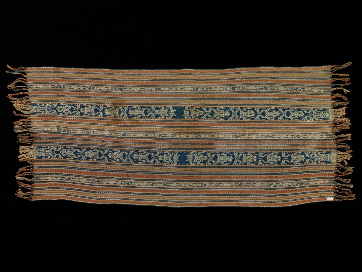 The kain kebat is a patterned, warp-ikat skirt worn by Iban women living in Kutai, East Kalimantan. Kain kebat were usually knee-length to facilitate movement, and held in place with accessories like hoops, chains or belts. The dominant pattern found on this skirt is a repetitive reptile-like form arranged along four bands, with various narrow-striped bands interspersed amongst them. The Iban peoples, drawing upon nature for inspiration, often depicted reptiles such as crocodiles or serpents in textiles.One of the key factors which differentiate this Iban kain kebat from other types of textiles made by communities in Indonesia is the use of yarn made of pineapple fibres instead of cotton. It was commonplace for textile weavers to obtain fibres extracted from tropical plants before cotton and silk was available. Kain Kebat did not denote a wearer's class or status in society, but were worn in ritual contexts such as while washing rice used in rituals and preparing offerings for sacred ceremonies.