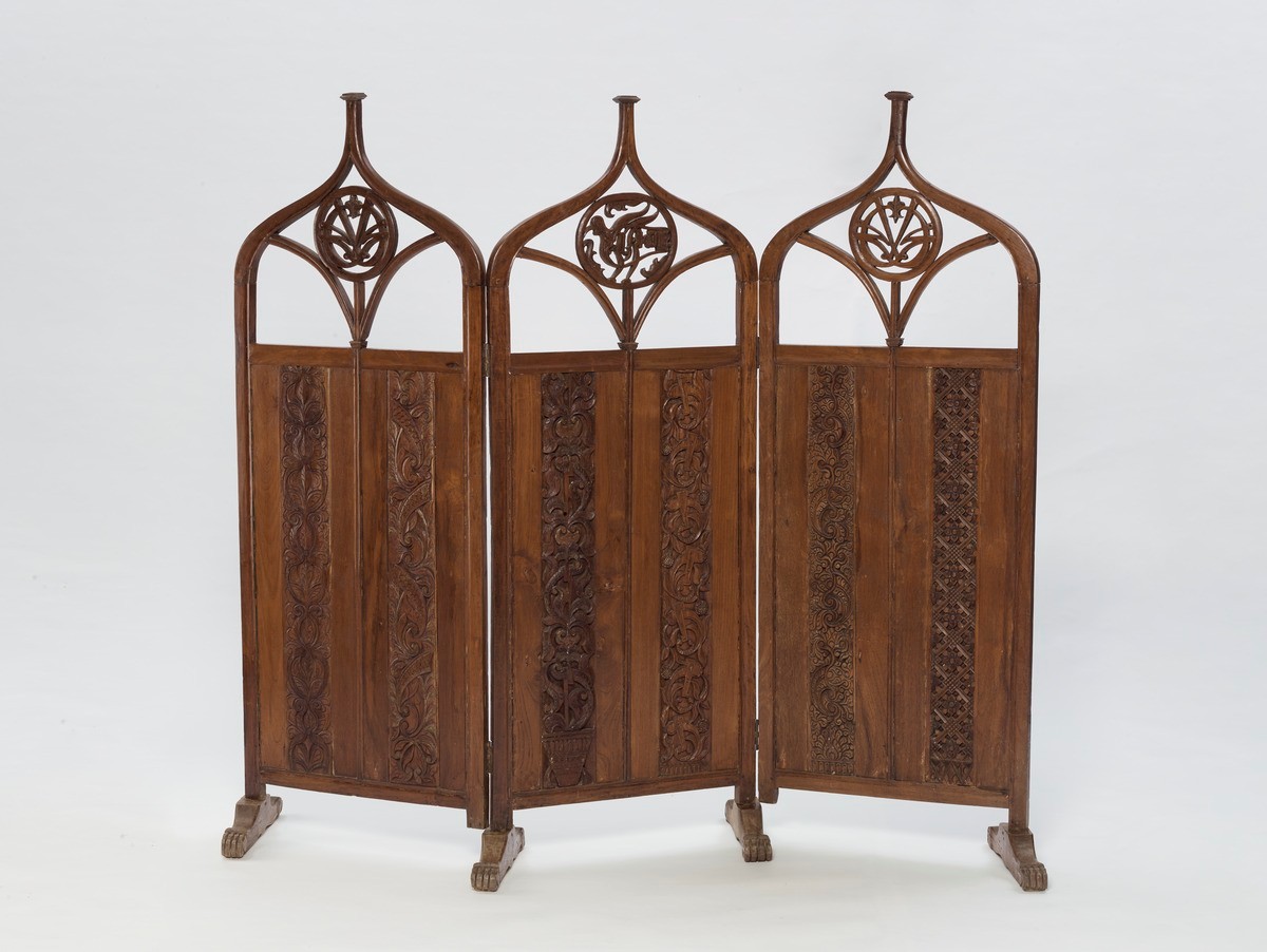 Literary references suggest that folding screens have already been in use in China since around the 3rd century BCE. They were used as portable room dividers or backdrops for social gatherings. This particular screen incorporates European stylistic features such as the carved leafy scroll decoration atop the wooden frame and the use of upholstered panels. European-style Chinese furniture was popular among the Straits Chinese communities living in Singapore from the late 19th century onwards. The upholstery as well as etched glass panels with bird-and-flower designs are, however, not original to this wooden screen. The original glass and upholstered panels were probably changed due to age or damage in the course of their use.