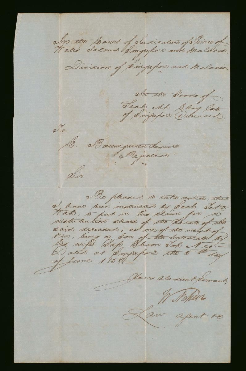 This photograph is a portrait of Seah Liang Seah. Printed on the card is the studio mark ‘G R Lambert & Co.’. Seah Liang Seah was a prominent leader of the Teochew community, one of the founding members of the Straits Chinese British Association, and successor to Whampoa on the Straits Legislative Council, to name but a few of his accomplishments. He was the son of the early Teochew leader Seah Eu Chin.