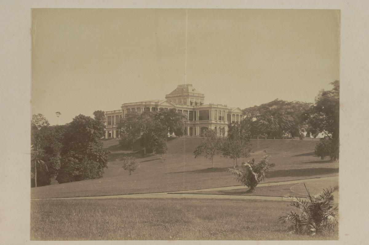 This photograph shows Government House (the Istana) nestled among the trees. A lone figure in the foreground looks in its direction. ‘20209. P. Z. – Singapore. Government House’ is printed at the bottom edge of the photograph. Government House was built in 1869 for the first governor of the colony of Singapore. It was renamed the Istana when the Yang di-Pertuan Negara Yusof bin Ishak took residence. Today, it is the official residence of the President of the Republic of Singapore.