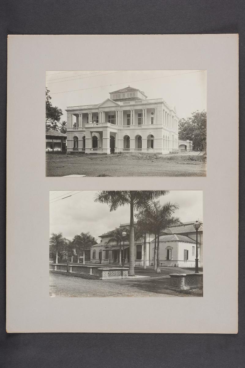 This photograph is part of a collection titled Souvenir de Deli, comprising the works of C. J. Kleingrothe, a photographer based in Sumatra in the late 19th and early 20th century. The photograph mounted on the top features the Hotel de Boer, built in 1898 at Cremerweg. The photograph below is that of the Town Hall, located right next to the Hotel de Boer.