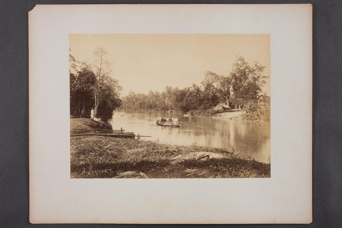 This photograph is part of a collection titled Souvenir de Deli, comprising the works of C. J. Kleingrothe, a photographer based in Sumatra in the late 19th and early 20th century. This image depicts a group of European men crossing a river on a wooden ferry with the assistance of locals. The photograph was published in Kleingrothe’s Sumatra portfolio.