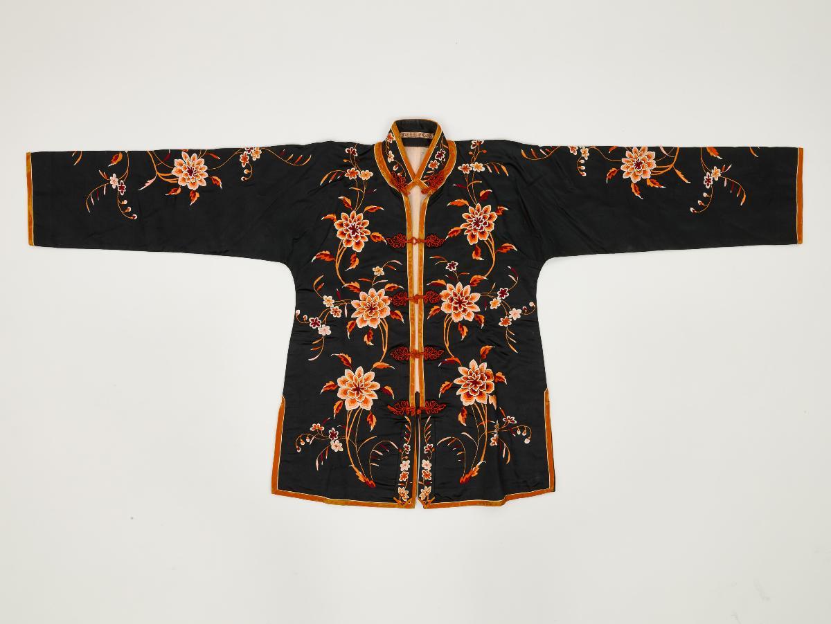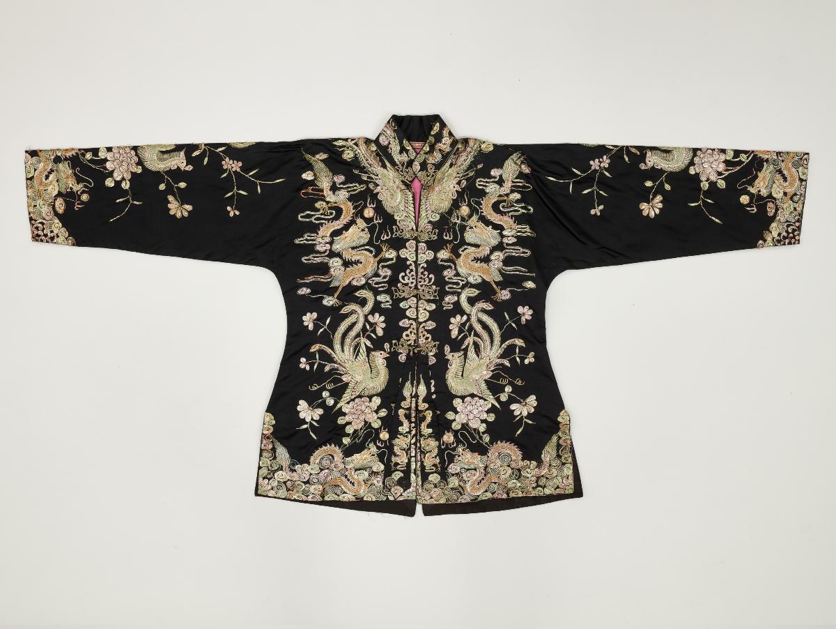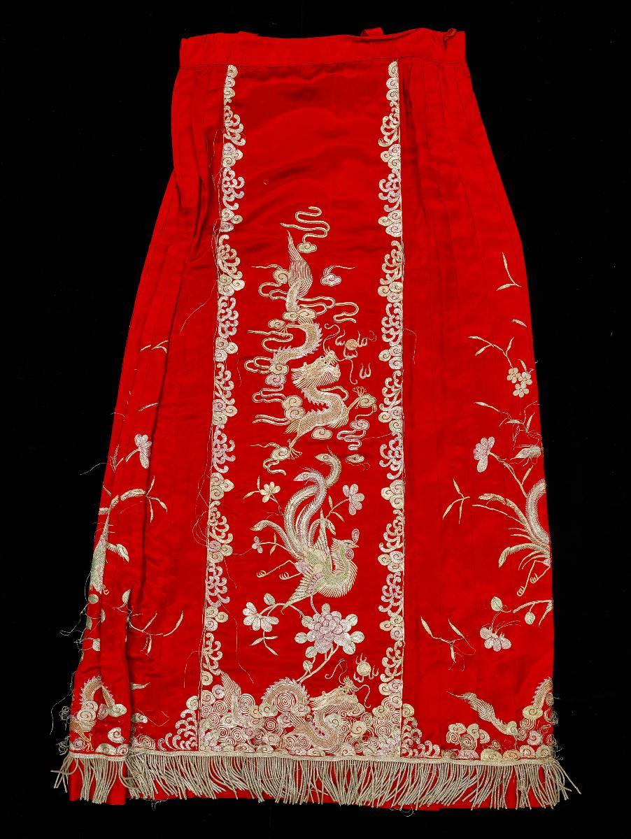 This kua, or Chinese bridal outfit, comprises of a fitted black jacket and red skirt, a colour combination popular in the 1940s and 1950s. It is embroidered with metallic thread that form motifs of dragons and phoenixes, and contains a Hong Kong shop tag. The kua came into fashion in the 1940s, when Chinese brides moved away from looser bridal styles to more tailored looks. After the bride wore it on her wedding day, it was subsequently used during special occasions such as Lunar New Year. Shanghainese tailors were highly lauded for their skills in creating such garments, many who fled to Hong Kong in the 1940s due to the civil war in China.