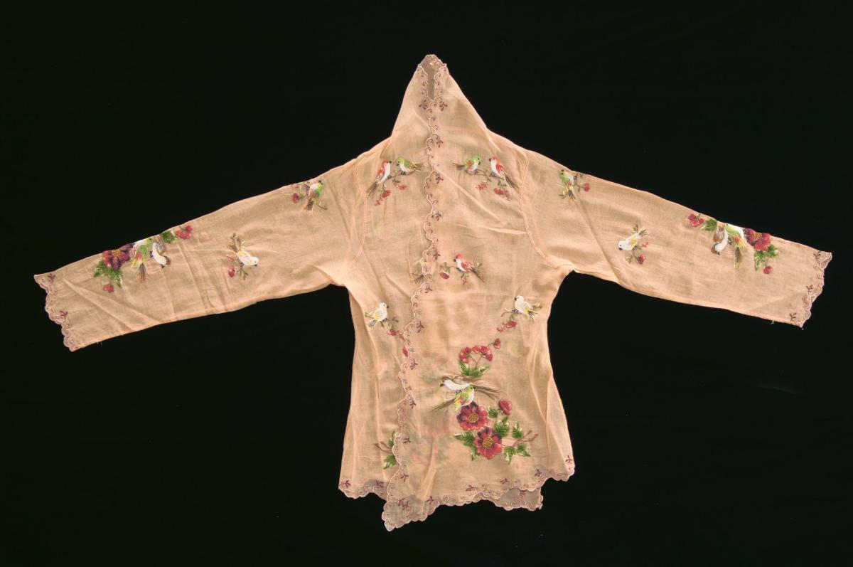 This kebaya is embellished with an elaborate border of flowers and leaves in various autumnal colours. It was possible by the 1920s to create elaborate lace-like patterns using sewing machines, which were widely available in the Malay Archipelago since the late 19th century. This was made by Chong Kim Neo (1916-1972), who made beaded slippers and garments from her home as she did not own a shop.