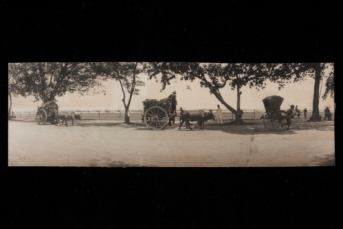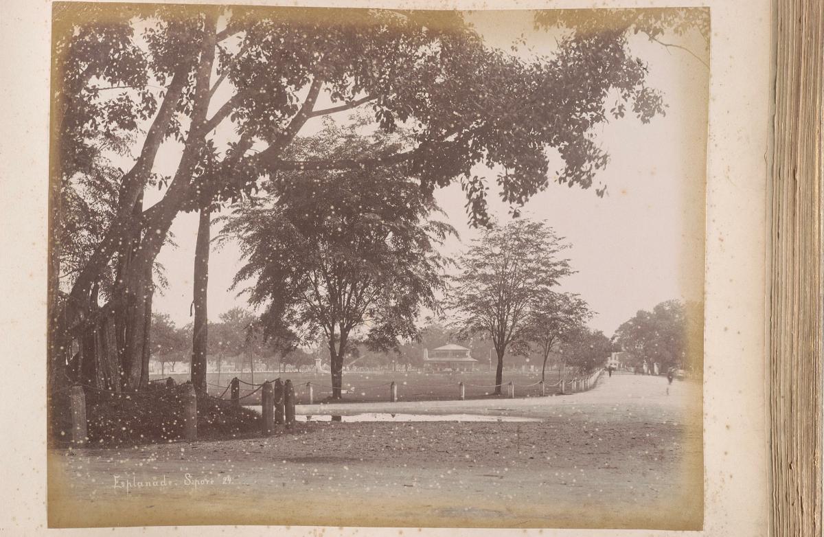 This is a view of the Esplanade, the recreational centre of 19th century Singapore town. A horse-drawn carriage or gharry is shown travelling around the bend of the wide road around the Esplanade. This was a common sight until the arrival of the rickshaw, which by the turn of the 20th century replaced the gharry as the primary mode of public transport in Singapore.
