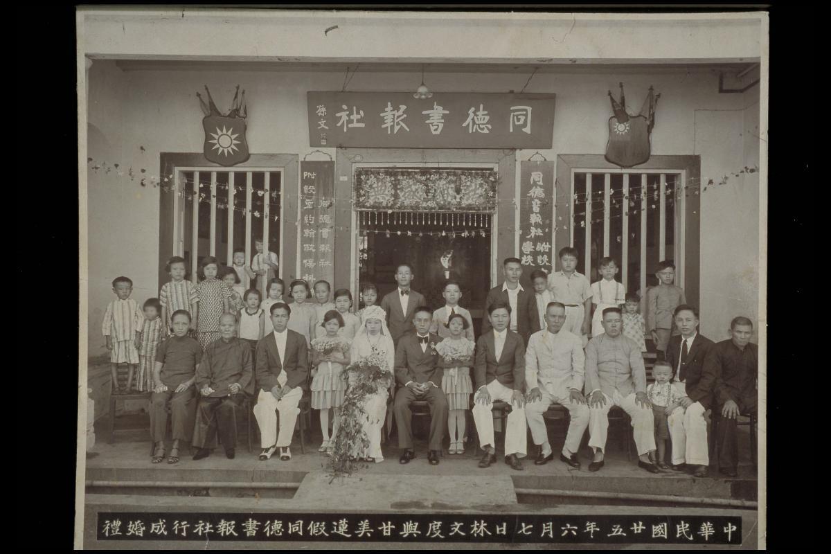 This is a group photograph of relatives and friends with the bride and bridegroom out the United Chinese Library.The United Chinese Library was set up in 1910 under the direction of Dr. Sun Yat Sen who used such institutions to disseminate his revolutionary ideas and garner support for his revolutionary uprisings.After the establishment of the Chinese republic in 1911, grand weddings were discouraged as being wasteful and extravagant, and simple civil weddings such as the one shown in the photograph gradually became the norm in Singapore.