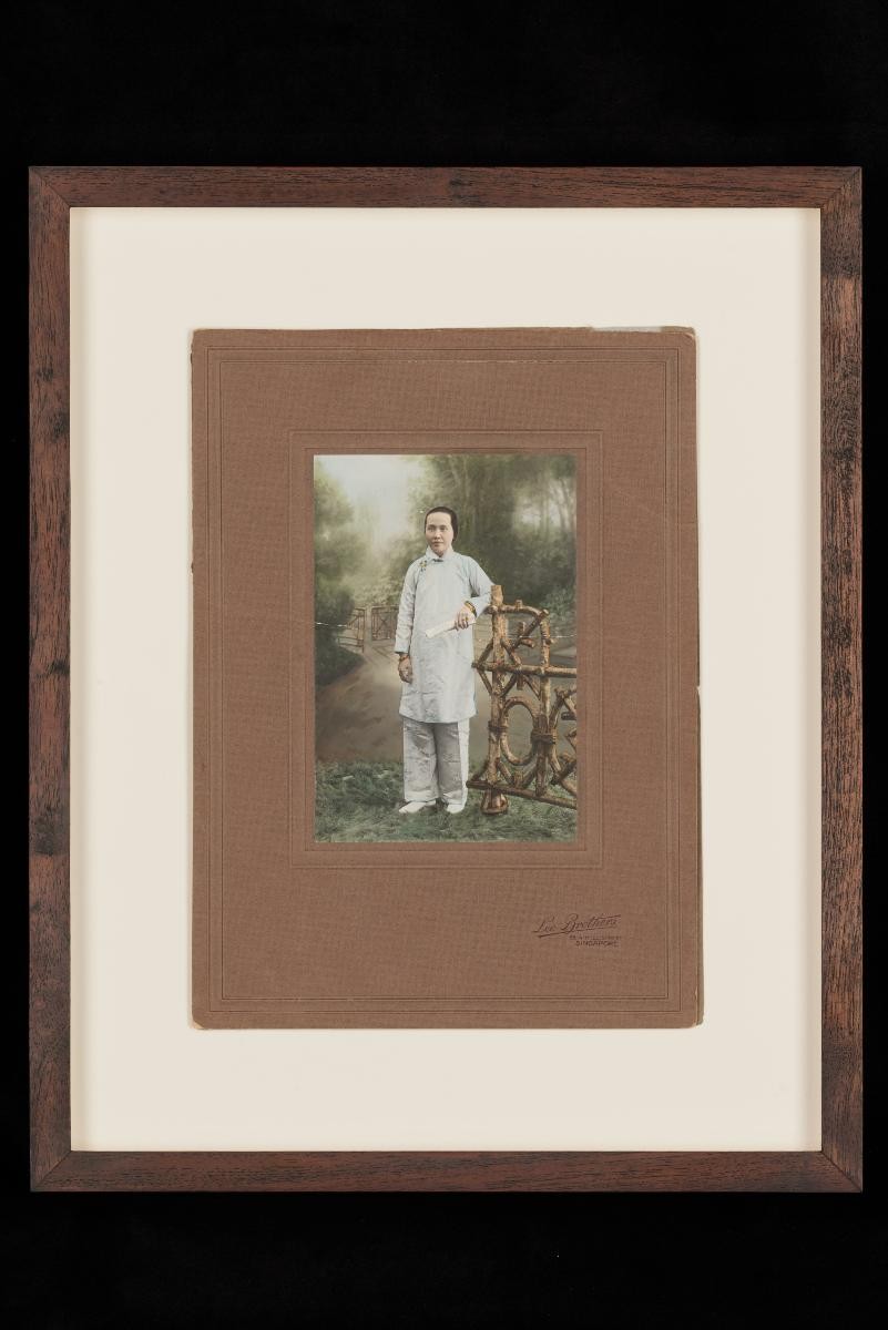 This carte de visite shows a woman dressed in a simple tunic (or baju kurong). The back of the carte is inscribed with Chinese script. Studios were already established across the Strait Settlements and the Dutch East Indies by the 1840s and became increasingly prevalent in the 1850s. During the 1920s, Chinese-owned studios dominated the studio photography trade in Southeast Asia.