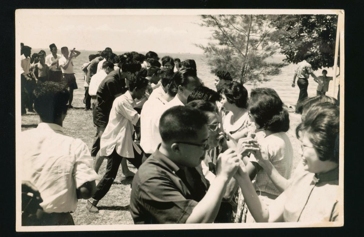 This photograph shows a group sitting on a lawn. It is accompanied by captions ‘Picnic at Tanah Merah’ and ‘Paul, Sam, Samuel Dec, Self, Betty Loke, May, Frances Leong, Hilary. August 1953’. With continuous improvement of camera technology, it became possible to take photographs outside a studio in the first decades of the 20th century. Many middle-class families collected photographs in albums as a way of documenting family life, or documentasi keluarga.