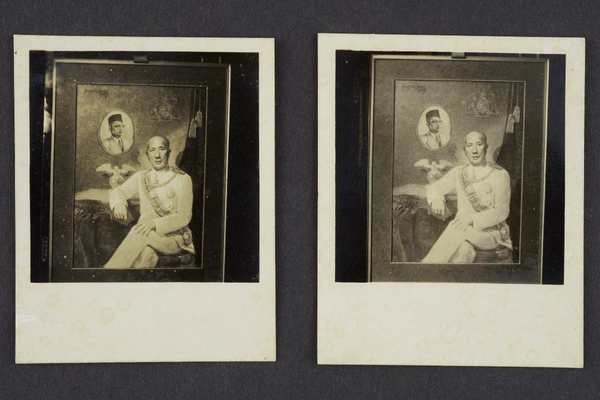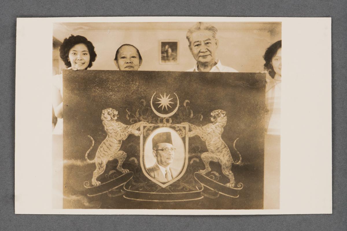 This photograph shows Low Kway Song, his two daughters and Tan Cheng Lock (1883-1960), Malayan statesman and founder of the Malayan Chinese Association in 1948. They are posing with Low Kway Song’s painting of the Malaysian crest with a portrait of Tunku Abdul Rahman, the first Prime Minister of Malaysia. Low Kway Song (1889-1982) was a pioneering artist who painted portraits of many prominent personalities in Singapore and Malaysia. He became the first artist to be paid a four-figure fee when he was commissioned to paint a portrait of the magnate Oei Tiong Ham in 1927. Low Kway Song established the first Straits Chinese Methodist Church in Malacca and in 1940 he became the Pastor of the Malacca Straits Chinese Methodist Church, where services were conducted in Baba Malay. Part of an archive which provides a record and glimpse into his personal life and artistic practice, this came from a collection which belonged to Low Kway Song.