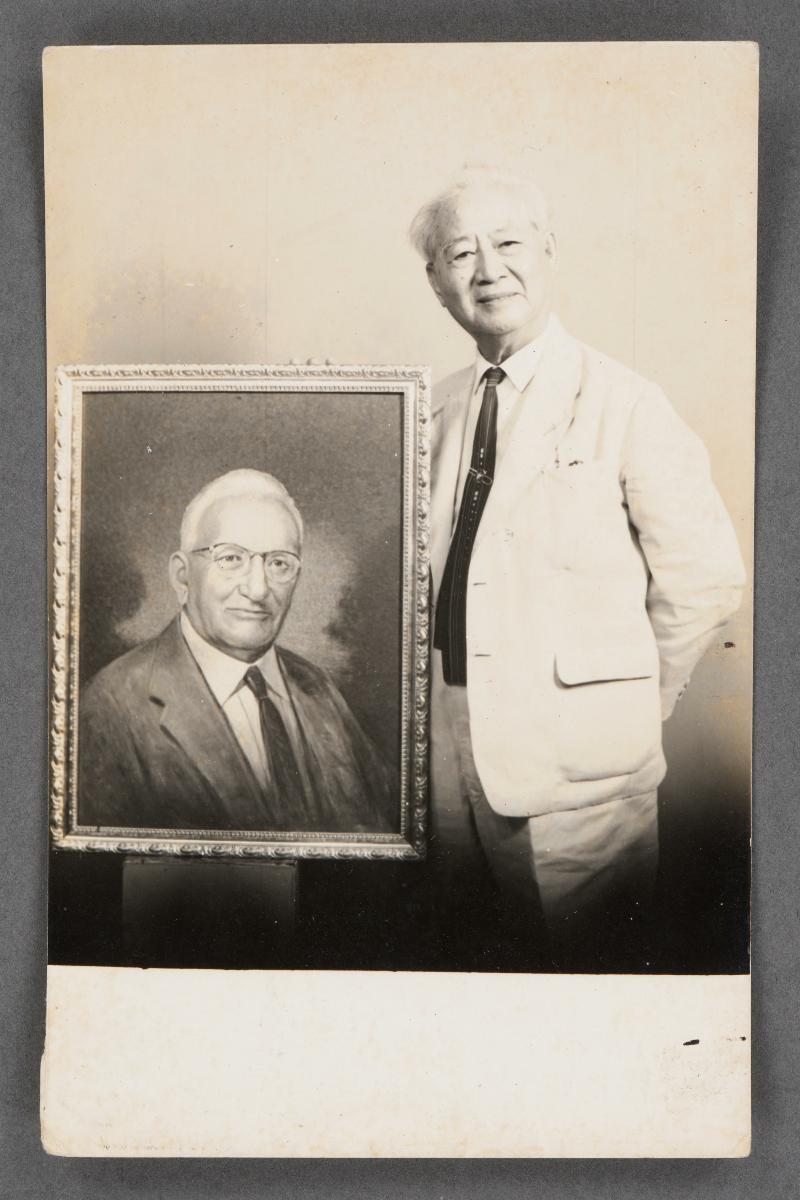 This photograph shows Low Kway Song holding a paintbrush and posing next to a portrait of a man. Low Kway Song (1889-1982) was a pioneering artist who painted portraits of many prominent personalities in Singapore and Malaysia. He became the first artist to be paid a four-figure fee when he was commissioned to paint a portrait of the magnate Oei Tiong Ham in 1927. Low Kway Song established the first Straits Chinese Methodist Church in Malacca and in 1940 he became the Pastor of the Malacca Straits Chinese Methodist Church, where services were conducted in Baba Malay. Part of an archive which provides a record and glimpse into his personal life and artistic practice, this came from a collection which belonged to Low Kway Song.