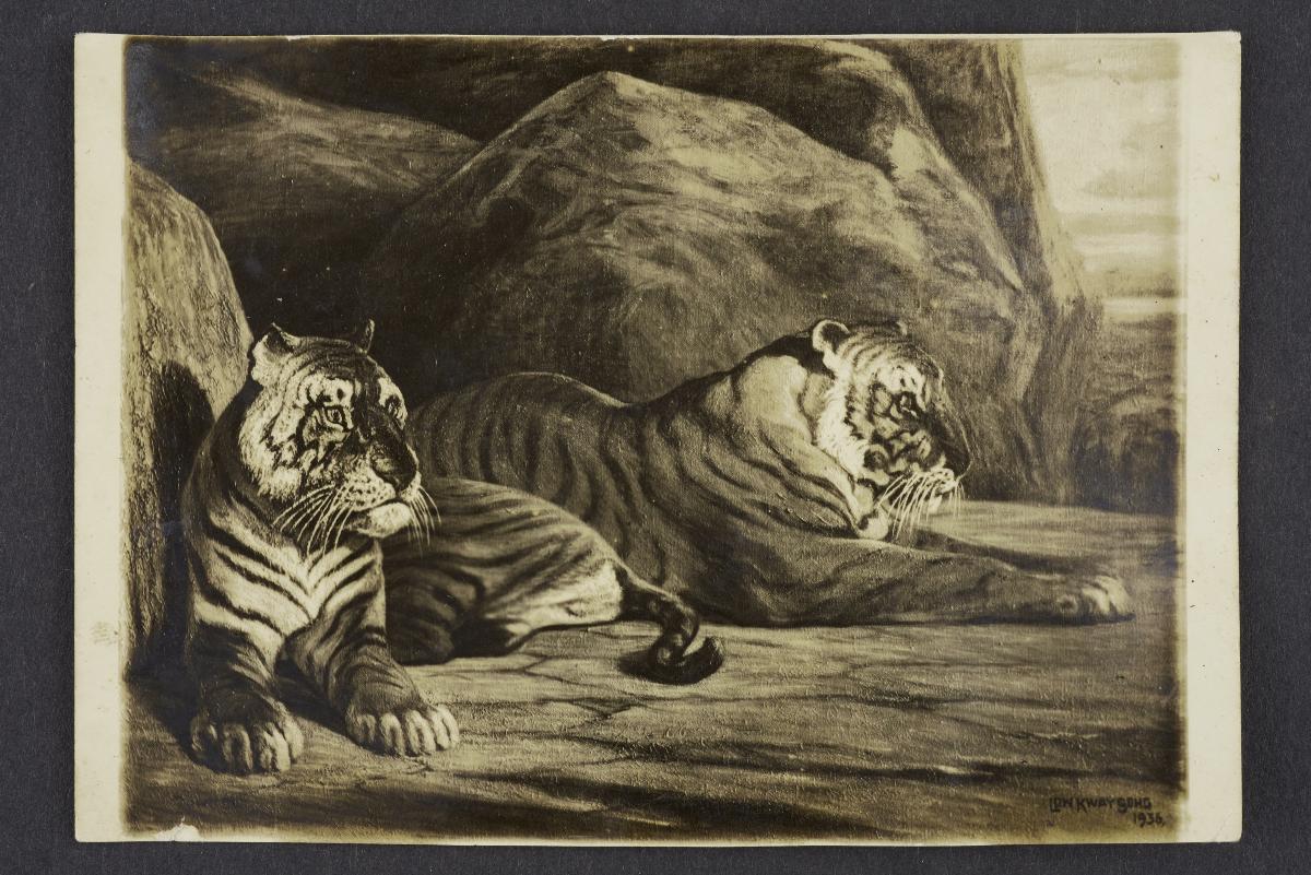 This photograph is of a painting depicting two monkeys and a parrot. ‘Dec 73’ is printed along the bottom edge. Low Kway Song (1889-1982) was a pioneering artist who painted portraits of many prominent personalities in Singapore and Malaysia. He became the first artist to be paid a four-figure fee when he was commissioned to paint a portrait of the magnate Oei Tiong Ham in 1927. Low Kway Song established the first Straits Chinese Methodist Church in Malacca and in 1940 he became the Pastor of the Malacca Straits Chinese Methodist Church, where services were conducted in Baba Malay. Part of an archive which provides a record and glimpse into his personal life and artistic practice, this came from a collection which belonged to Low Kway Song.